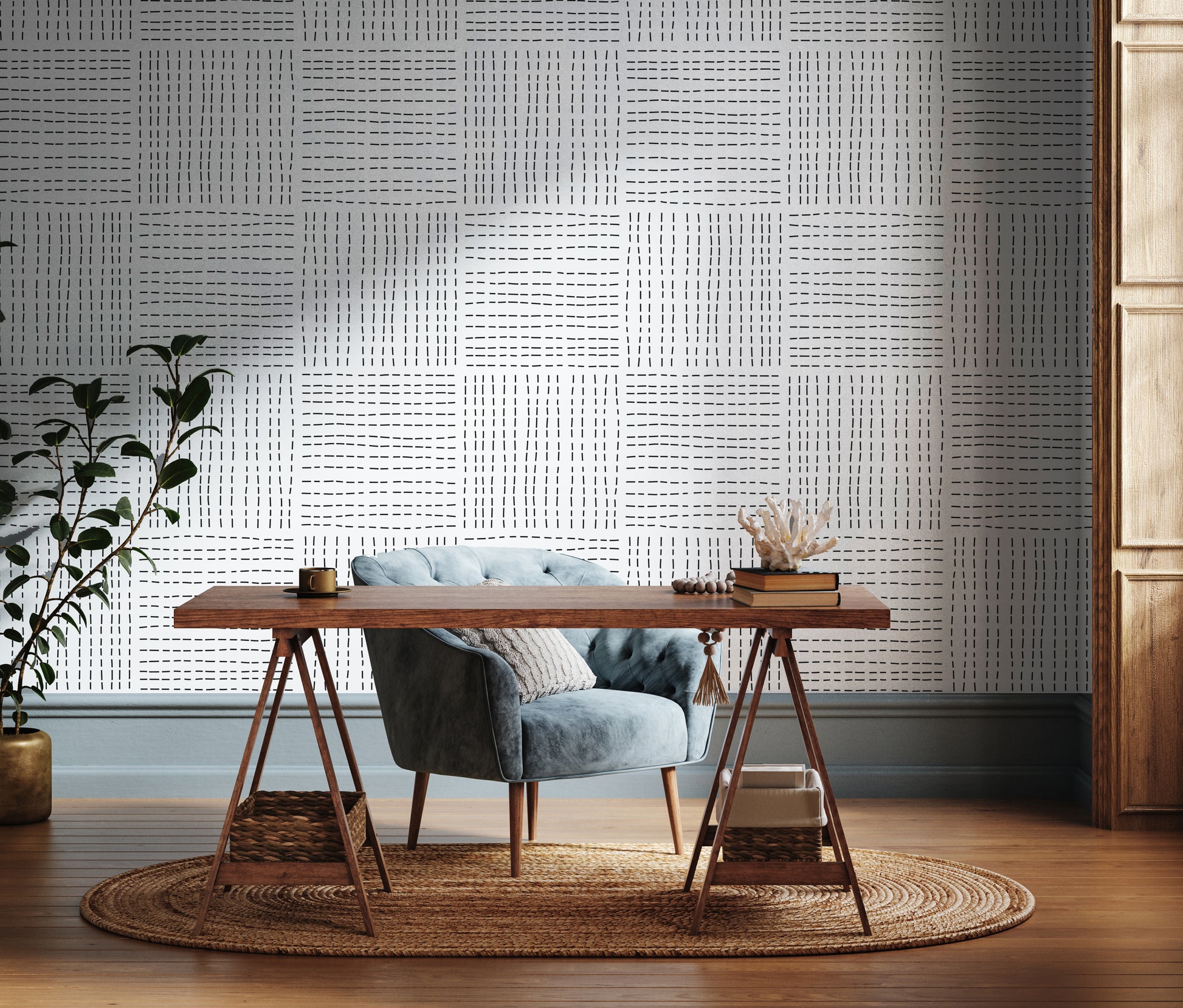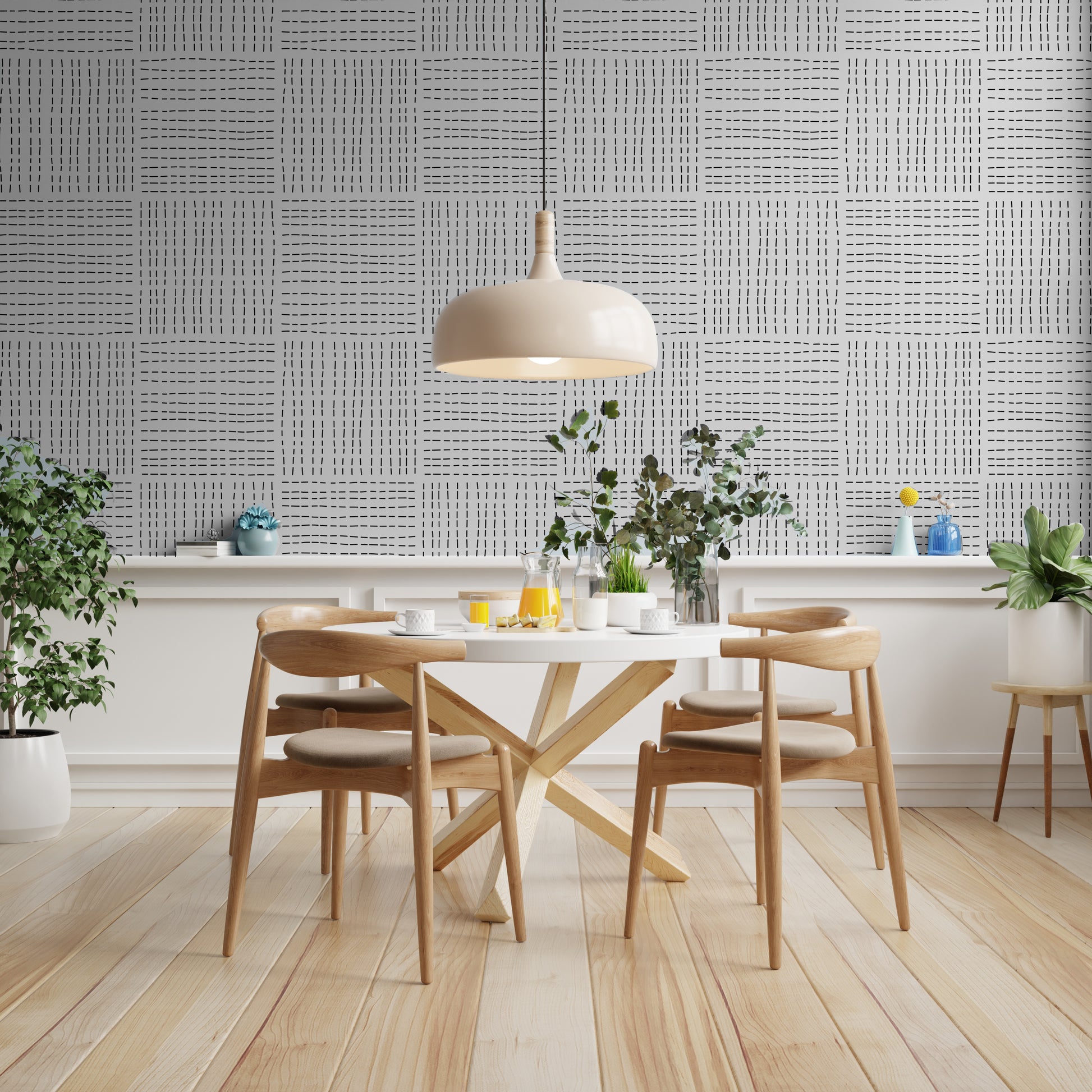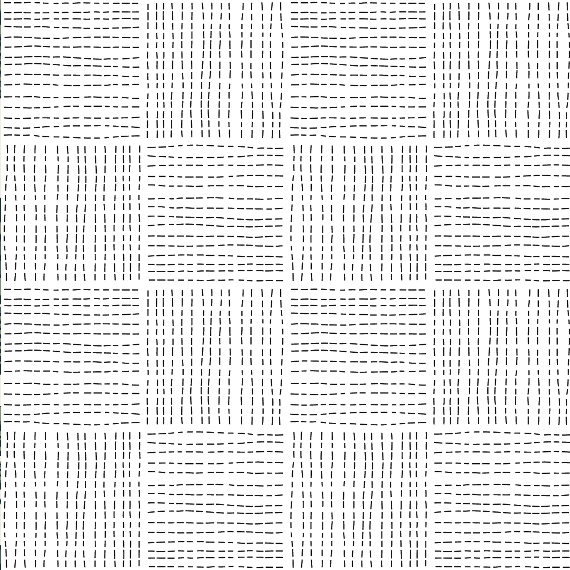 This wallpaper features small black uneven dashes in a woven square pattern on a soft white background.