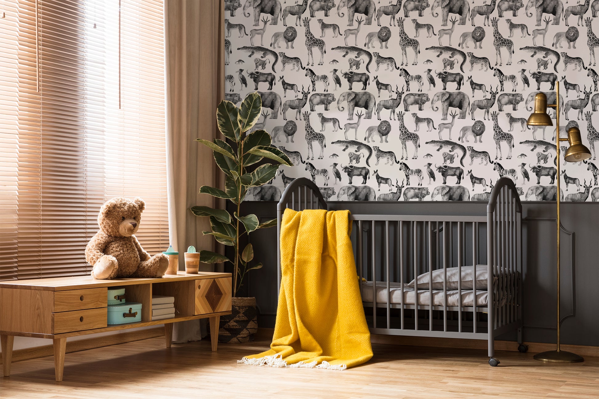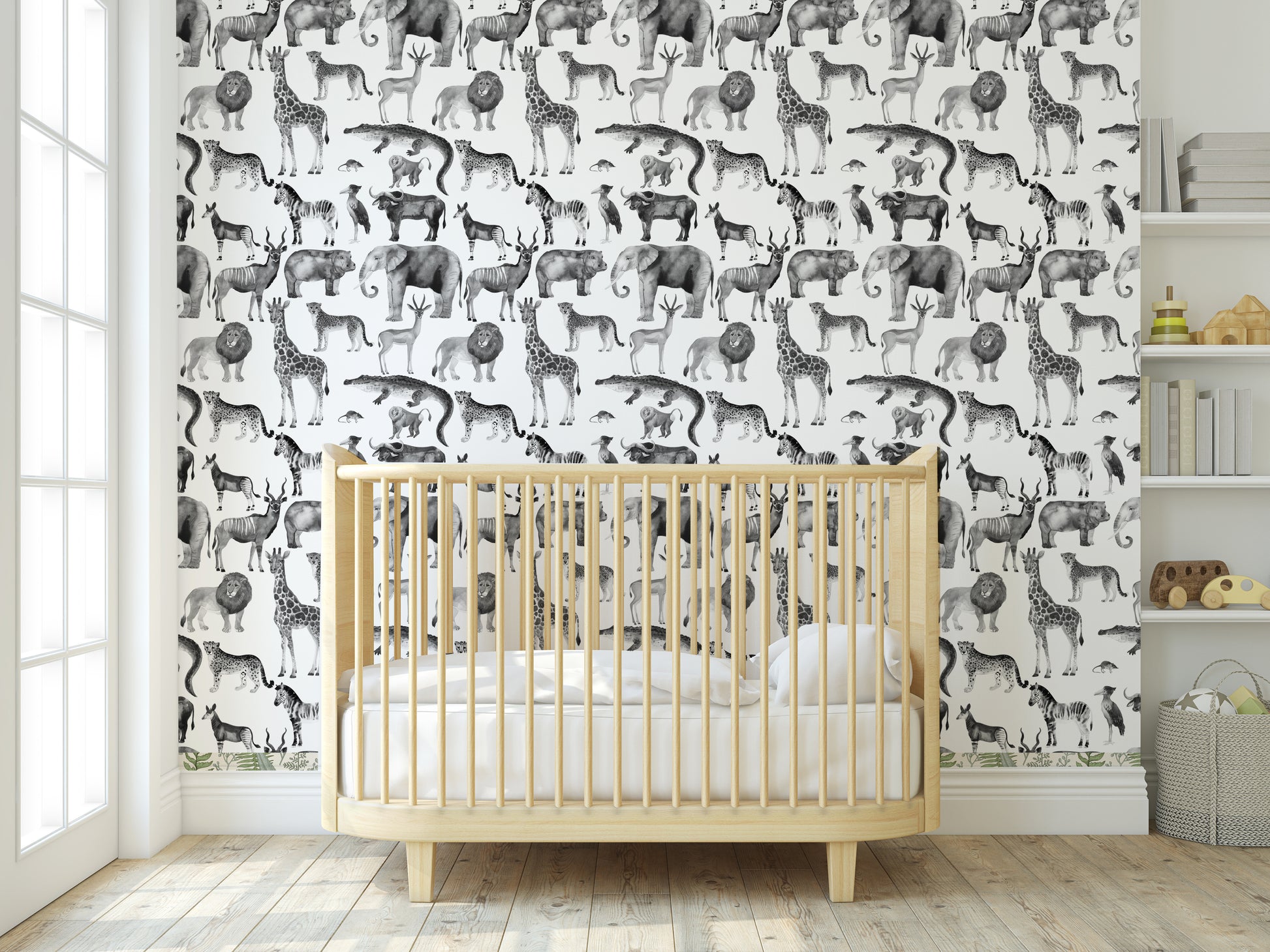 This Black and White watercolor zoo wallpaper is perfect for a gender neutral nursery or playroom. The wallpaper feature Rhinos, Lions, Zebras, elephants, Crocodile, Leopard, gazelle, and Buzzard.