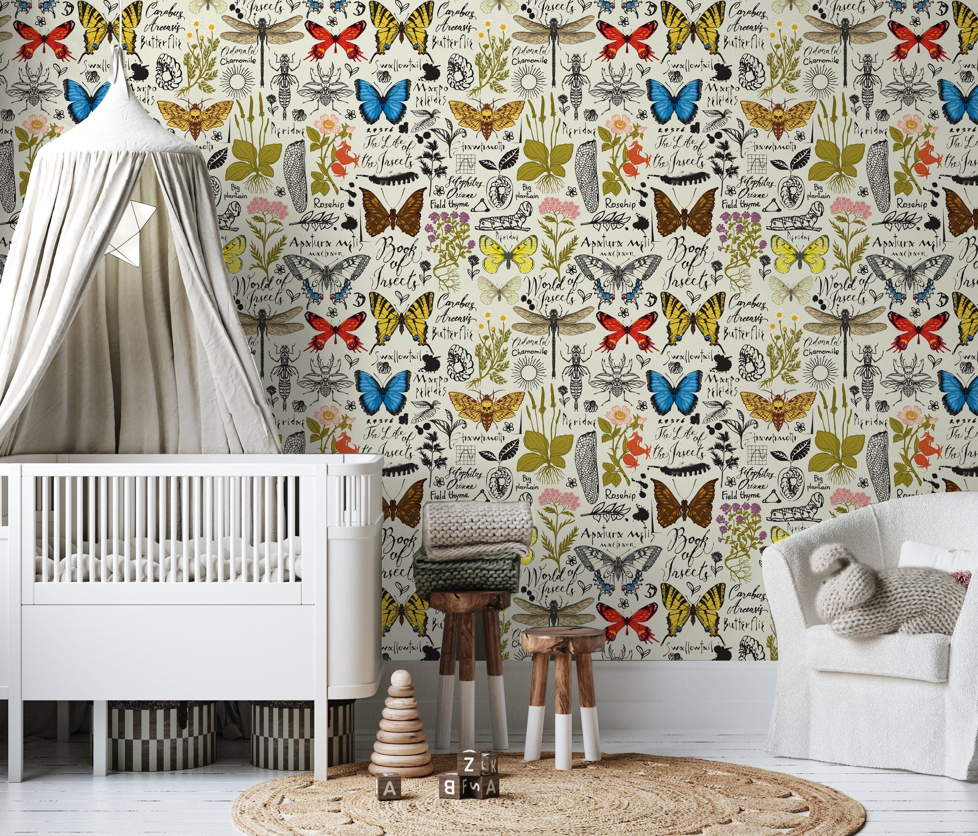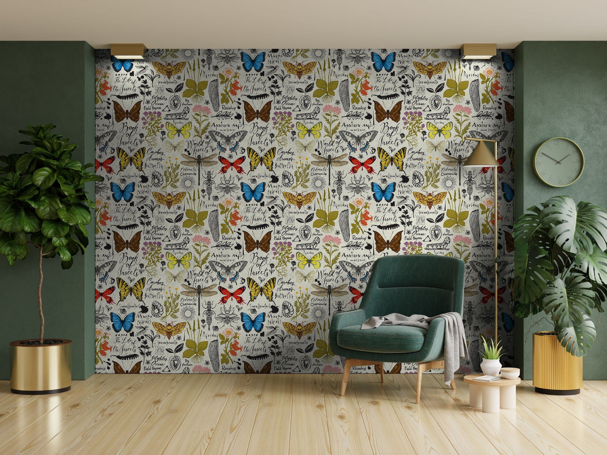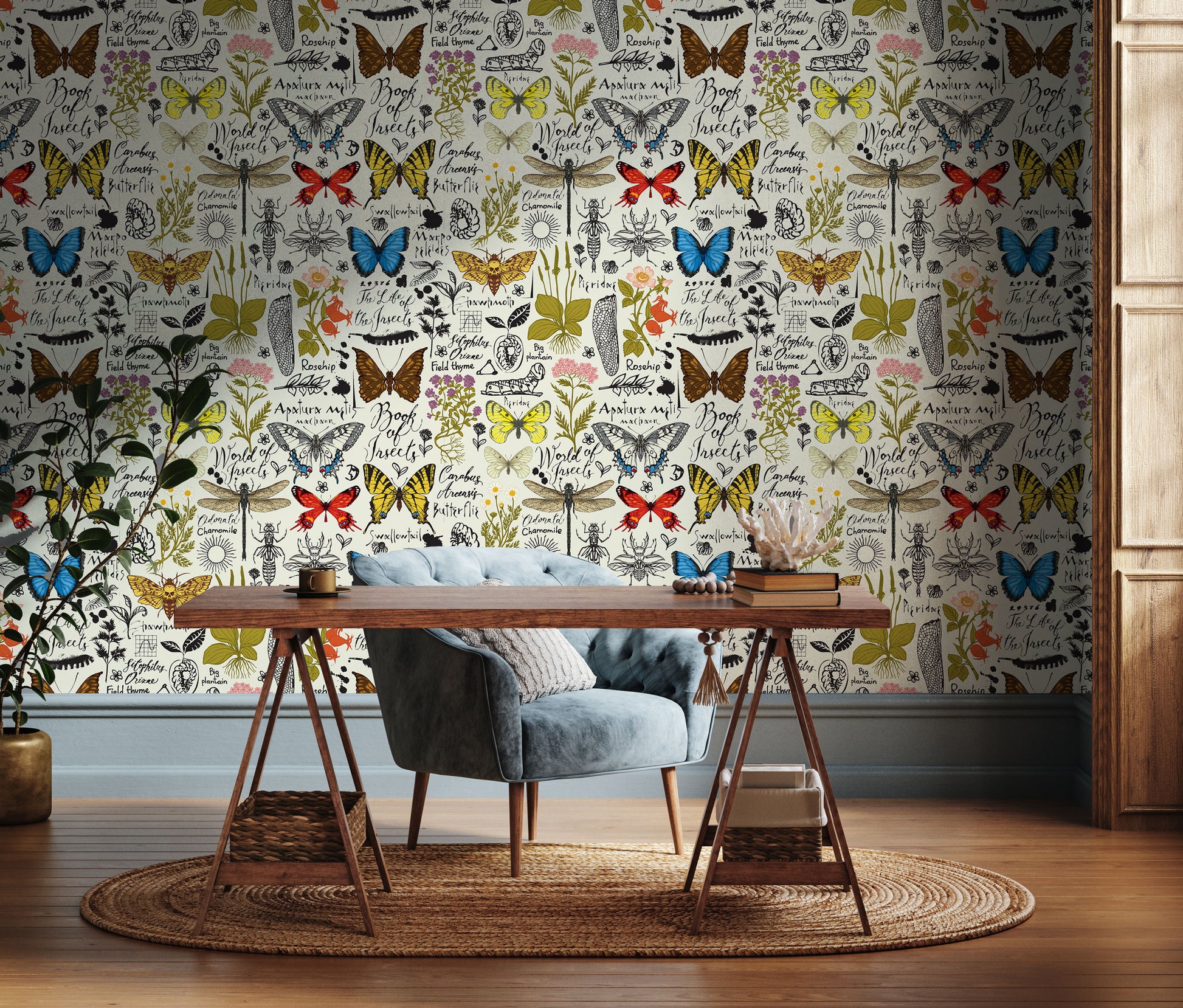 This high quality insect wallpaper features butterflies, dragonflies, moths in a hand drawn pattern.