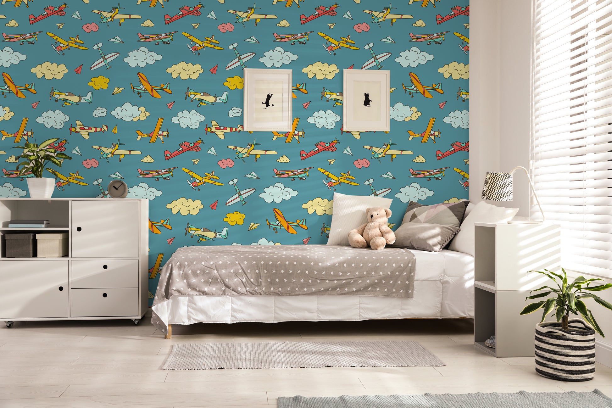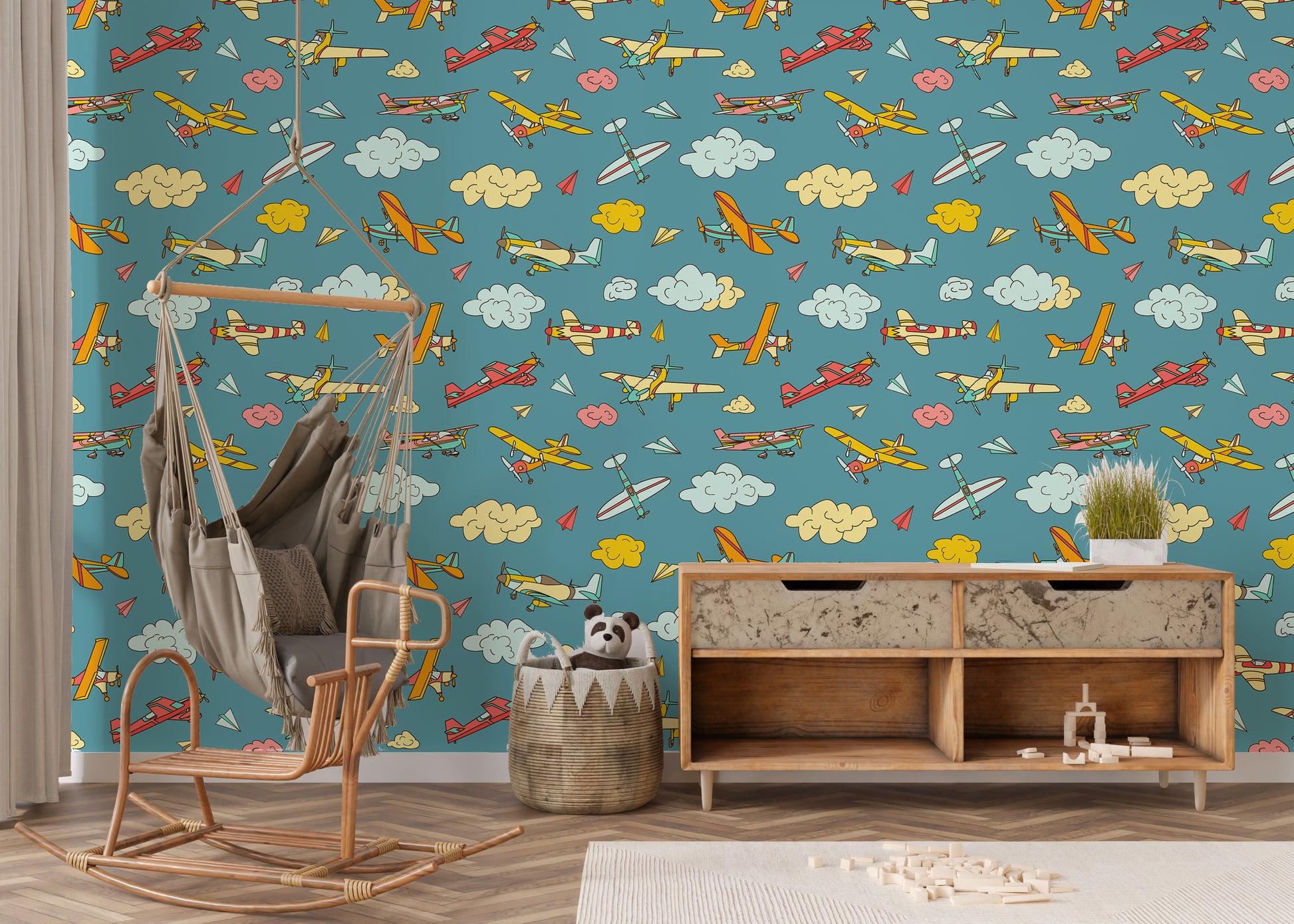 Oh the place you'll go with this storybook print. The wallpaper feature colorful airplanes and puffy cloud on a muted teal background.