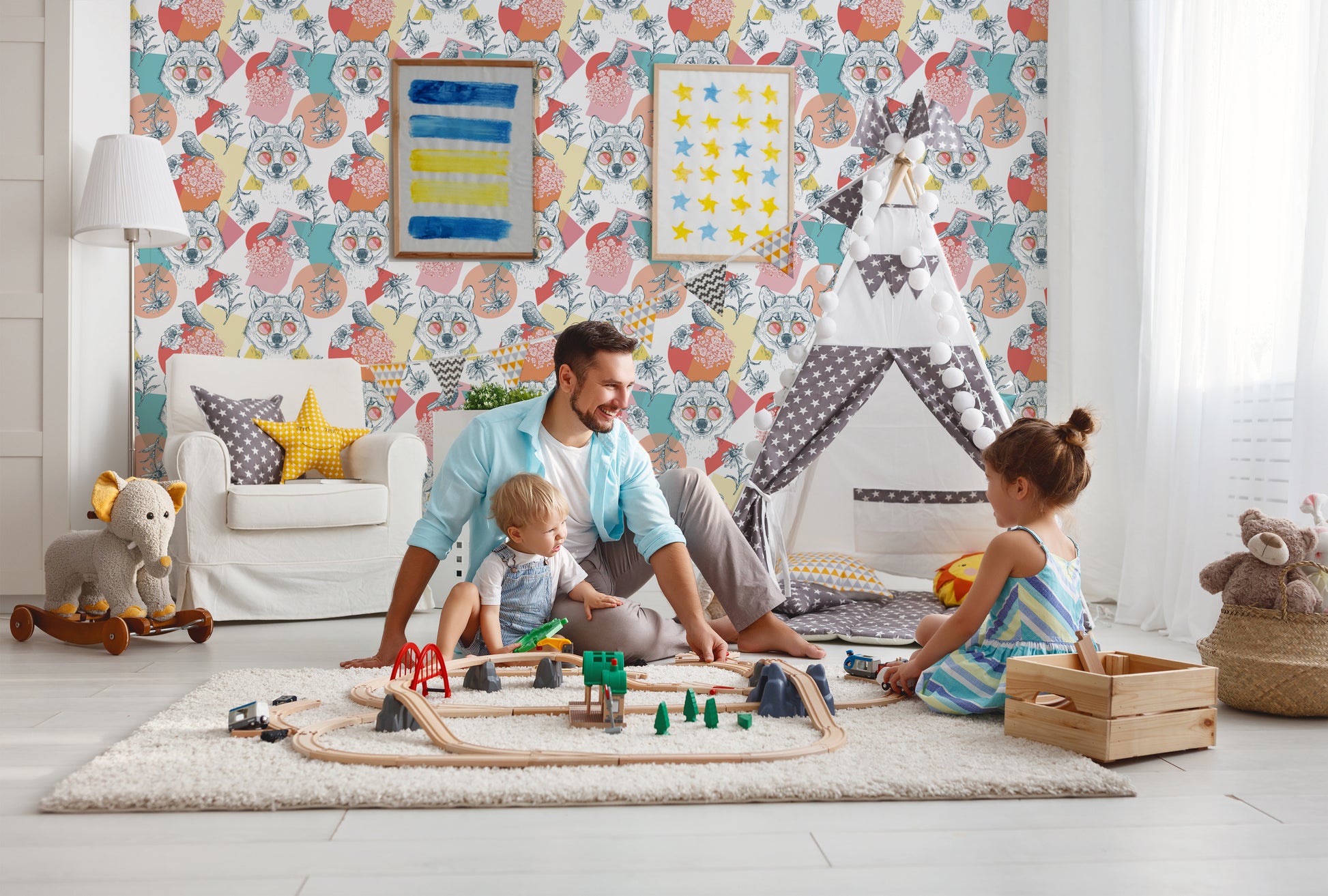 This pop art style wallpaper features a wolf in sunglasses and flowers on colorful background perfect for a bold little trendsetter.