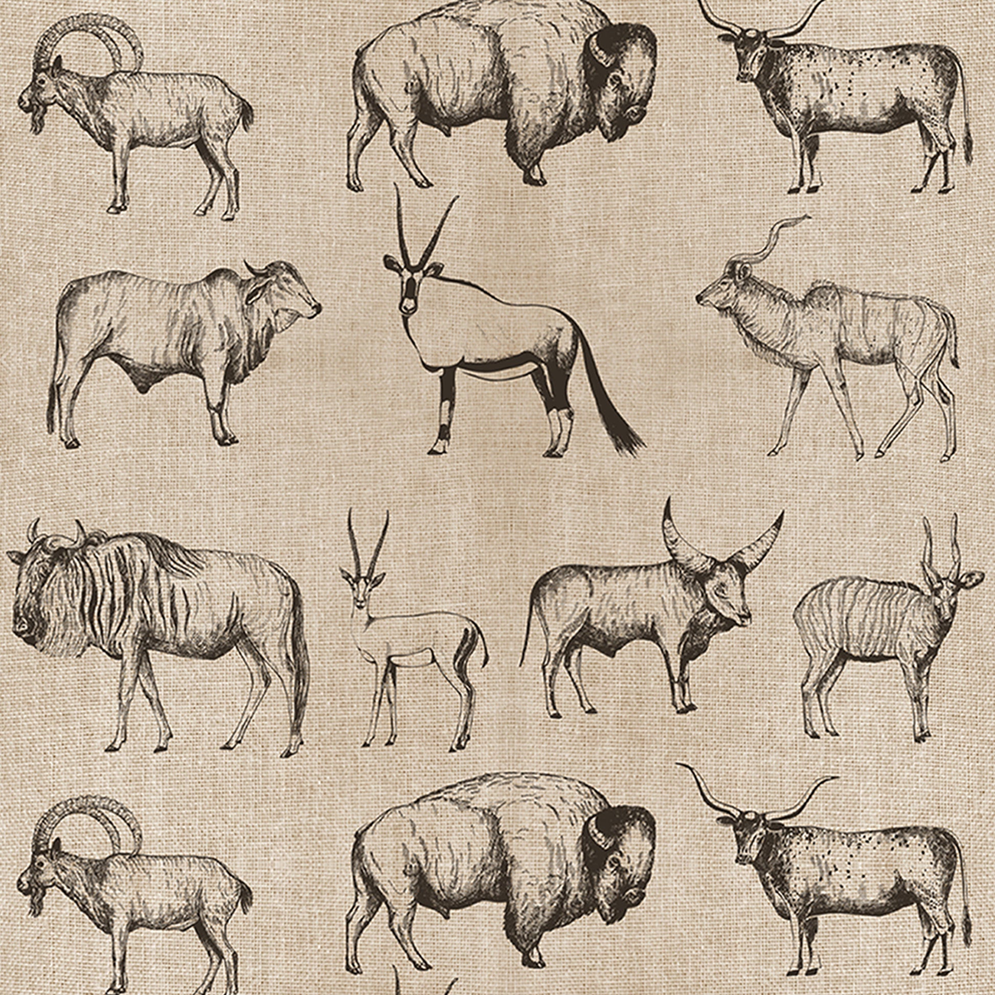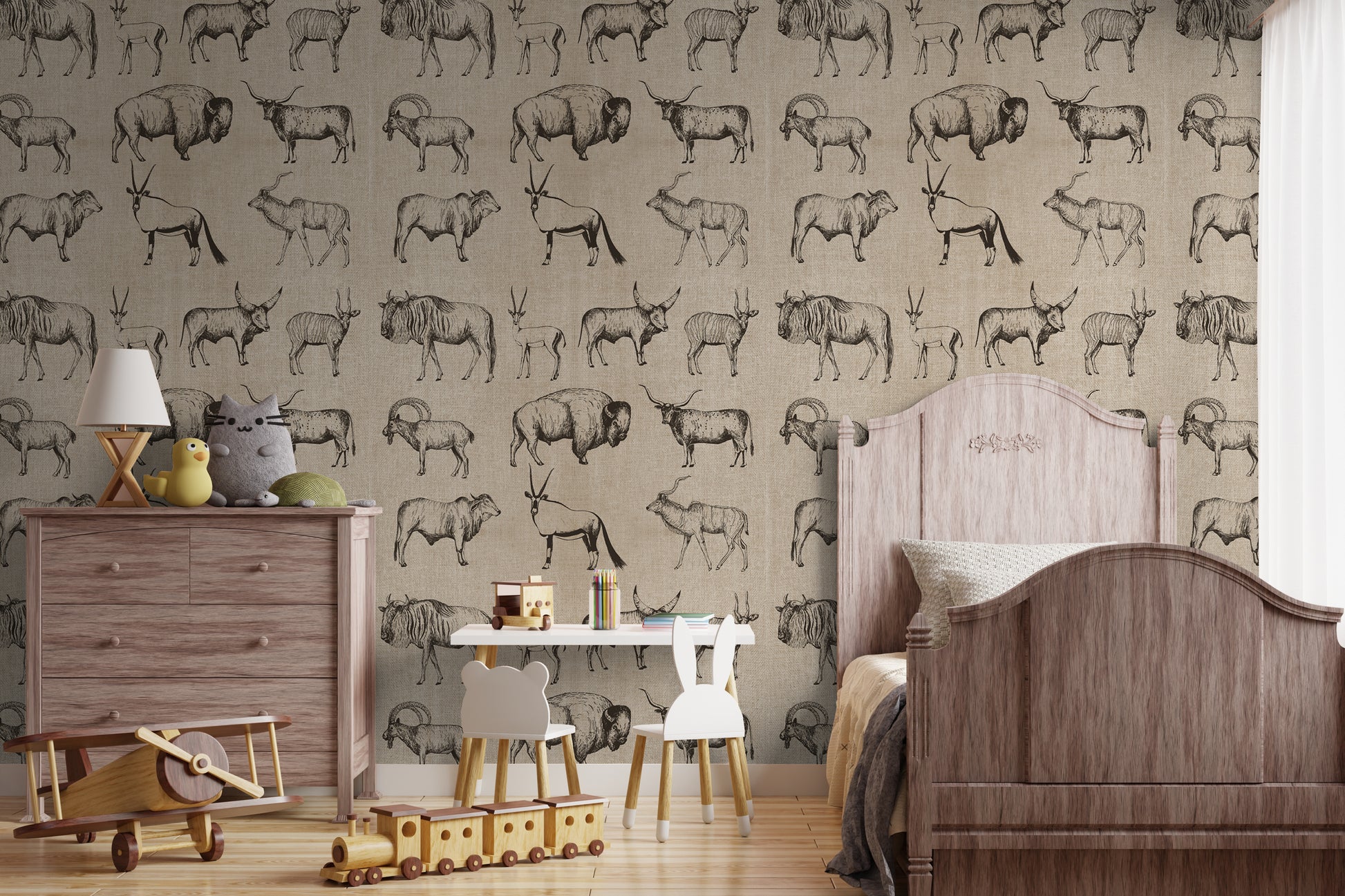 This western wallpaper features Buffalo, Bison, and other antlered friends in a rich brown with a printed burlap texture beige background.