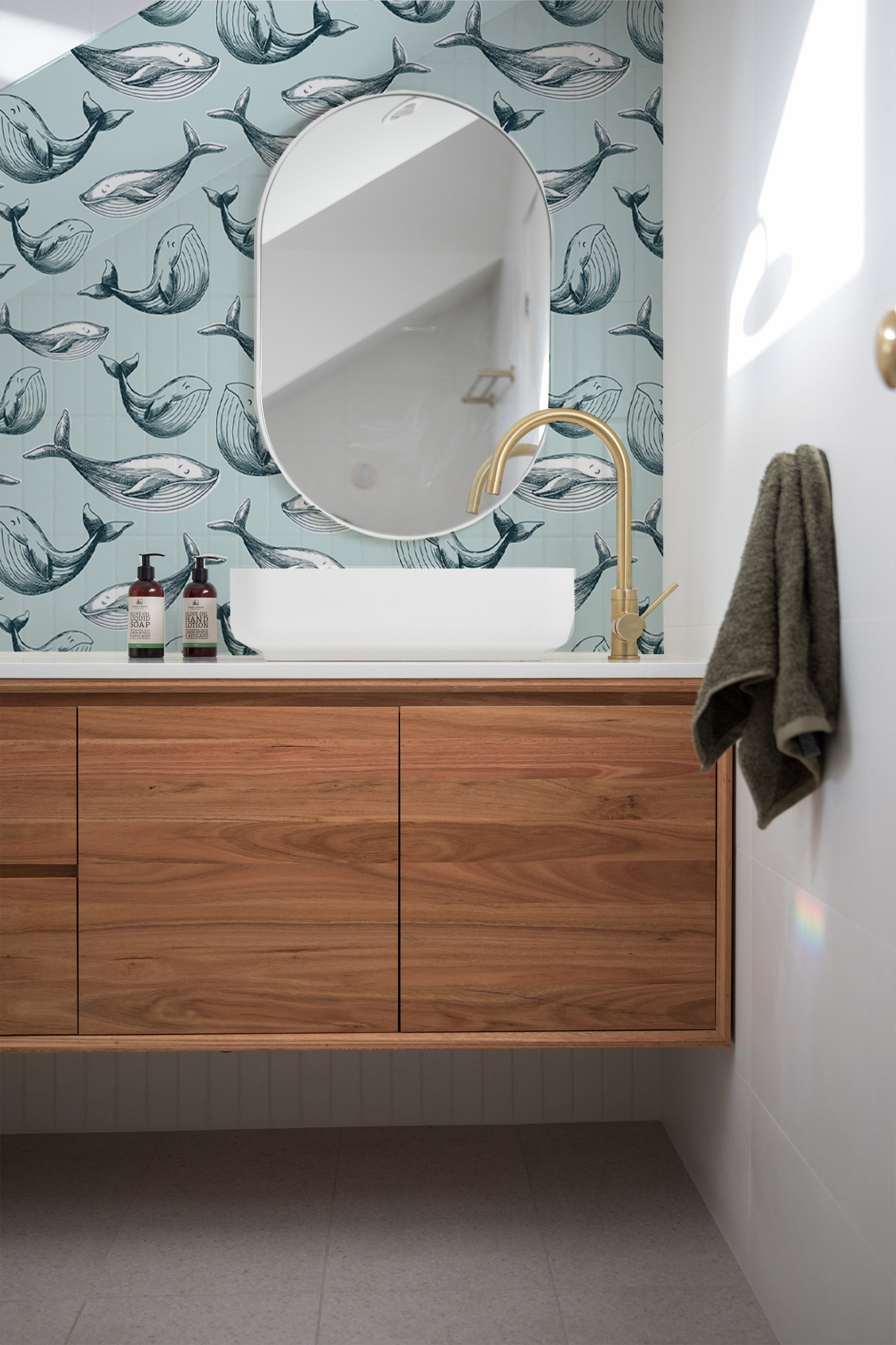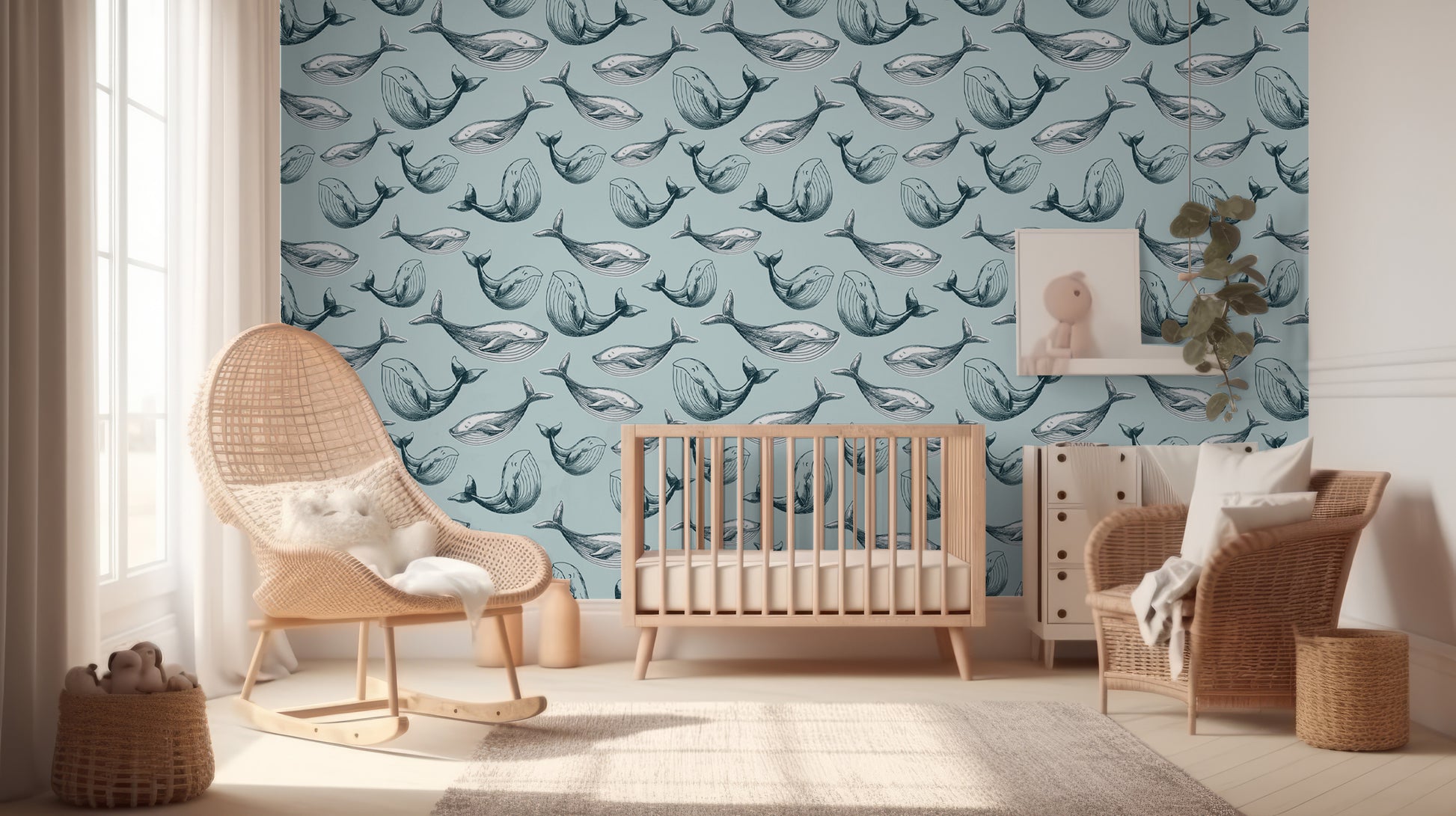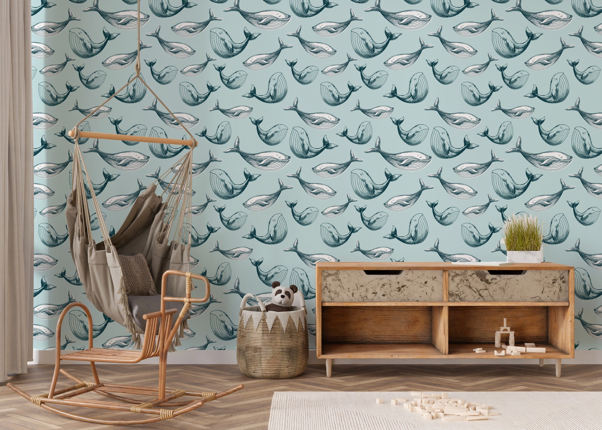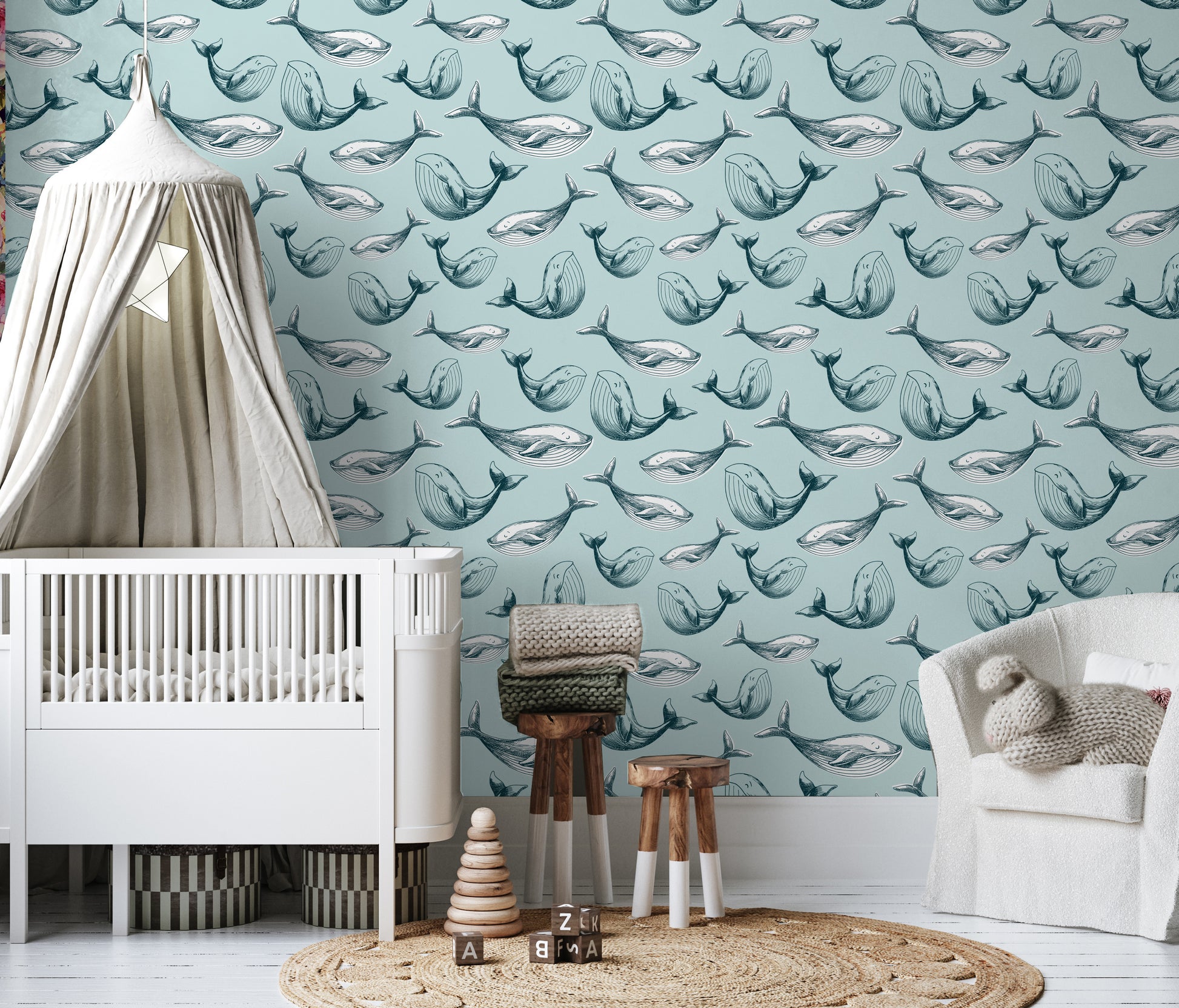 Nautical Whale Removable peel and stick wallpaper. Our blue whale pattern wallpaper will be having you thinking about life under the sea. Perfect for a nautical nursery, beach house, or just so that you feel as though you are always on vacation.