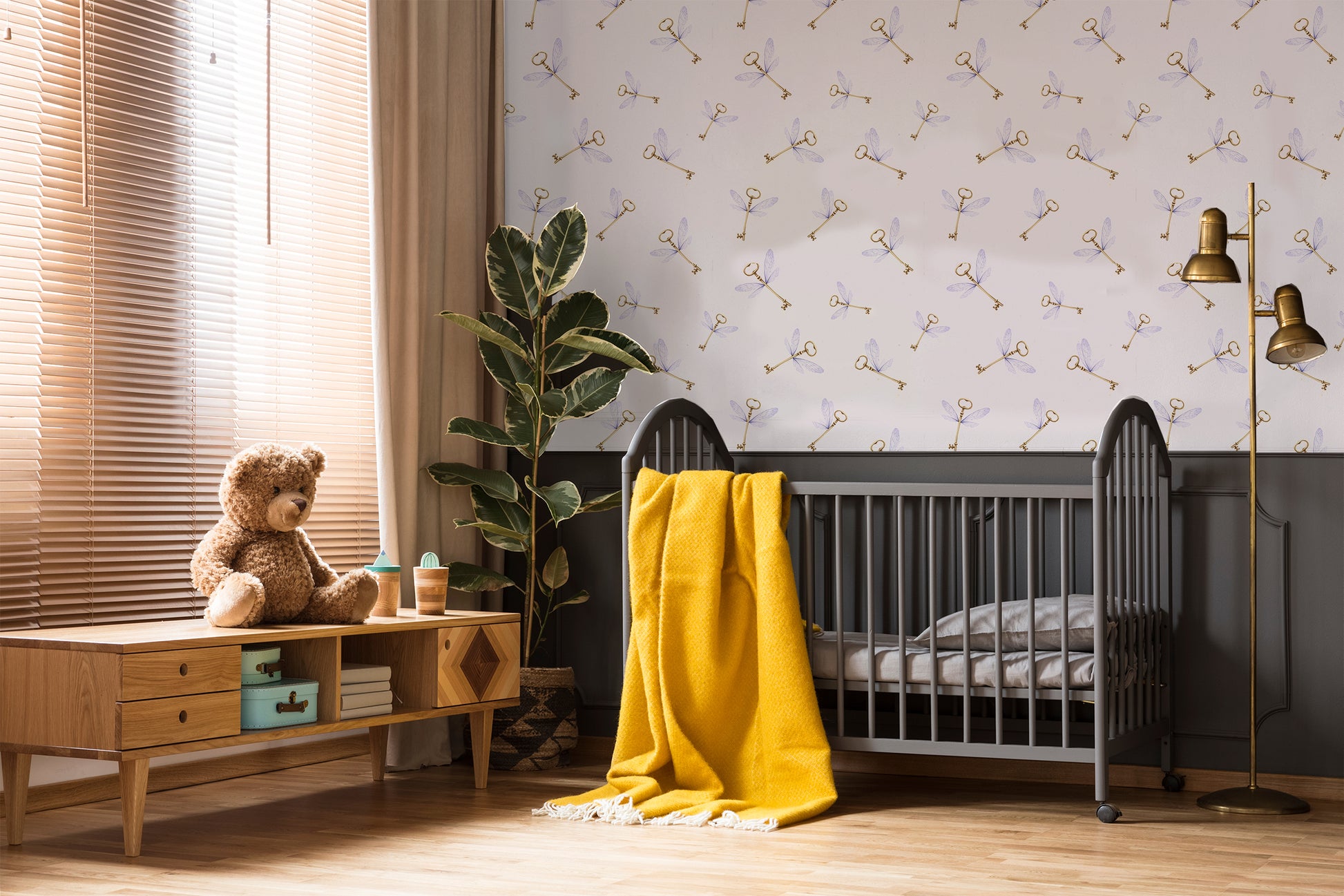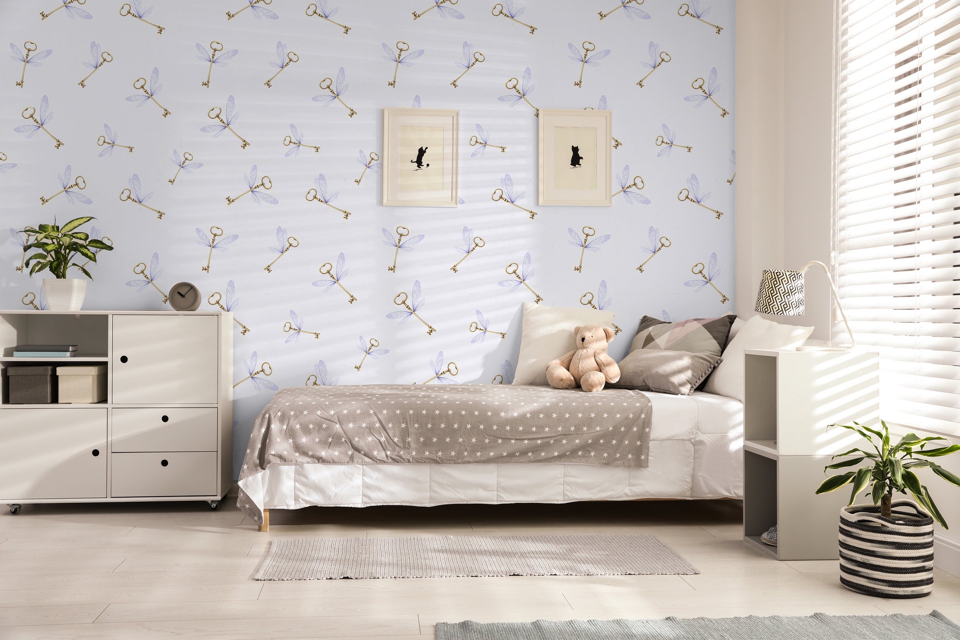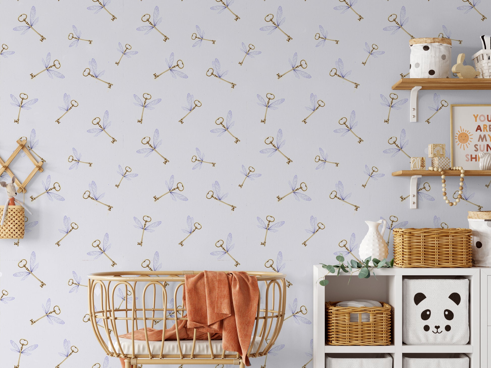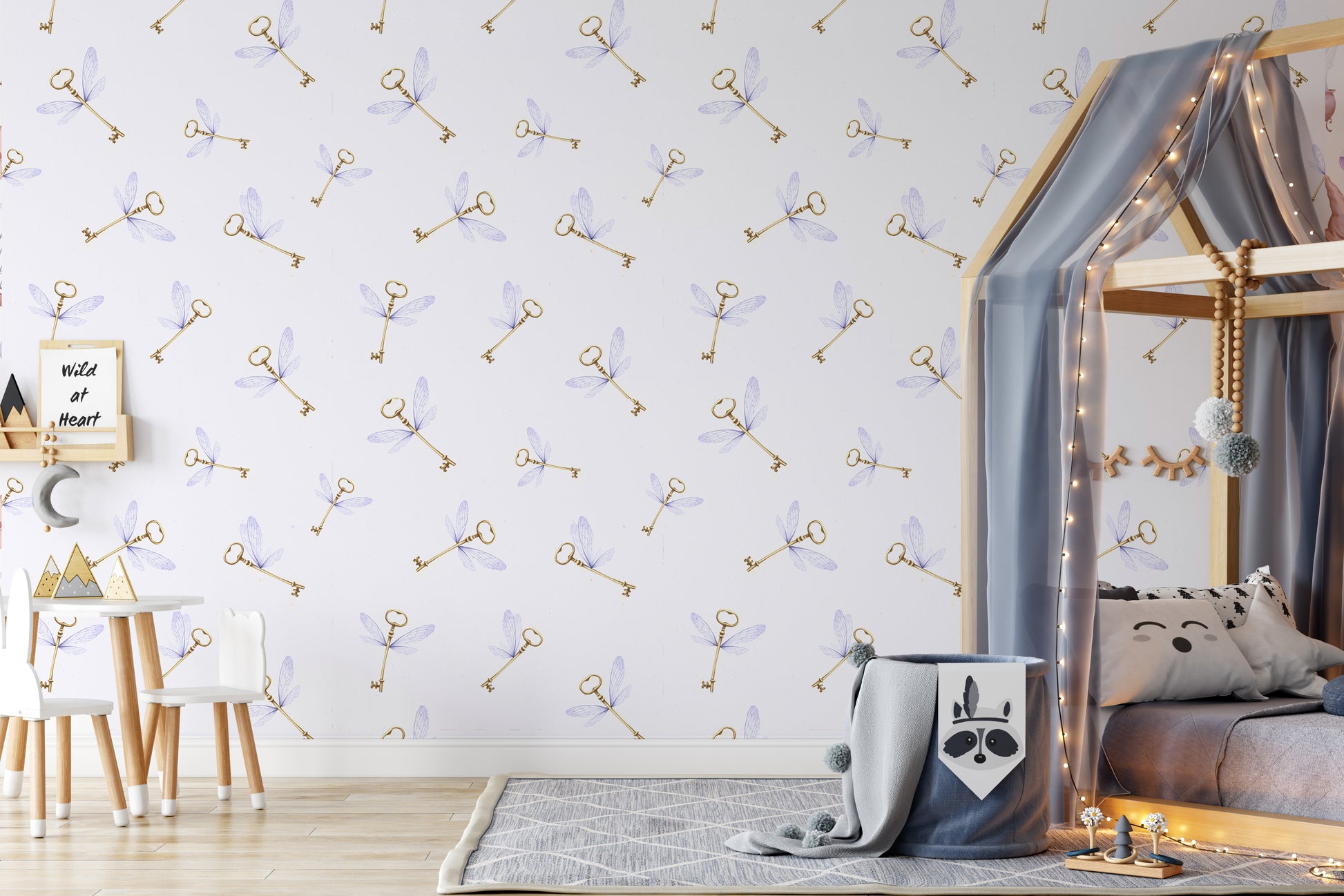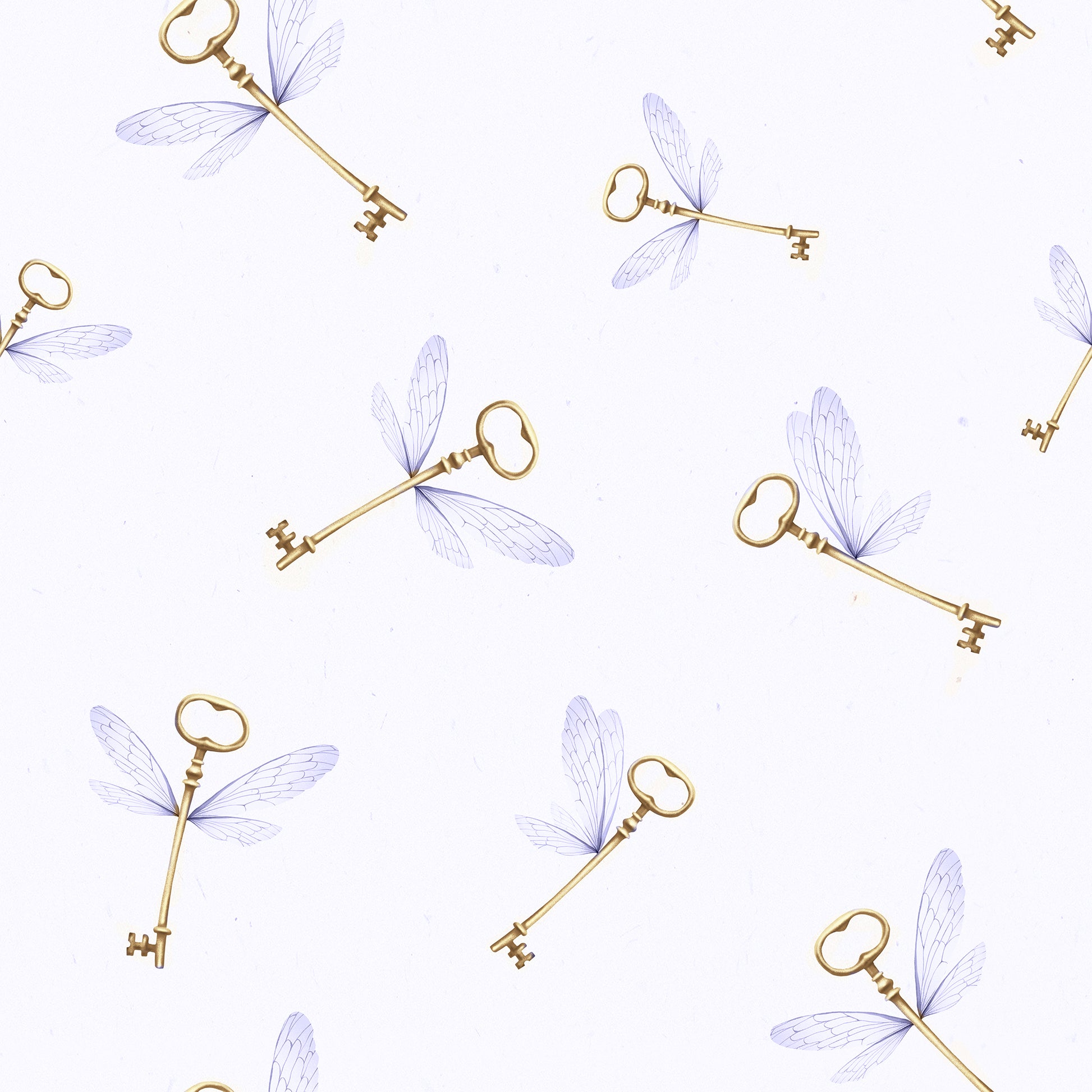 This girly wizard flying key removable peel and stick wallpaper features golden keys with purple wings on a soft white background . Thi wallpaper would make any child's room absolutely magical.