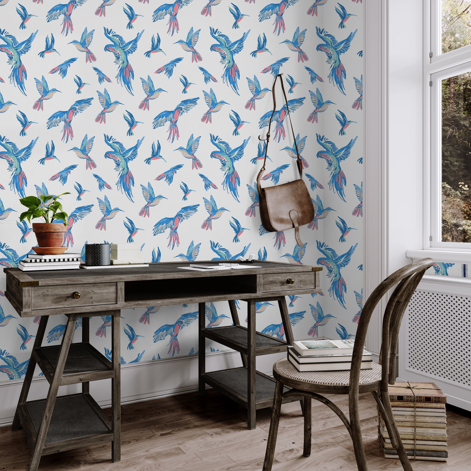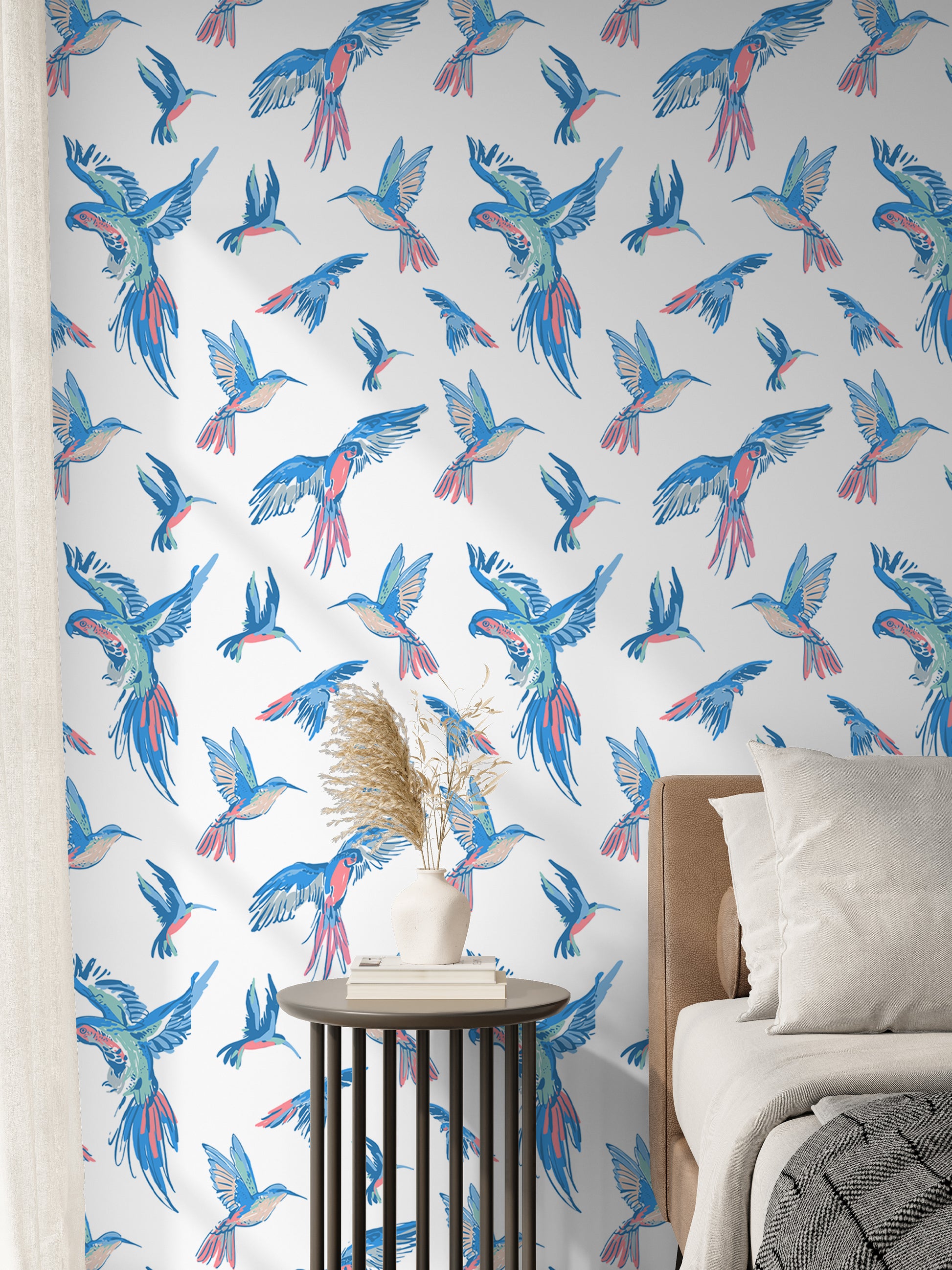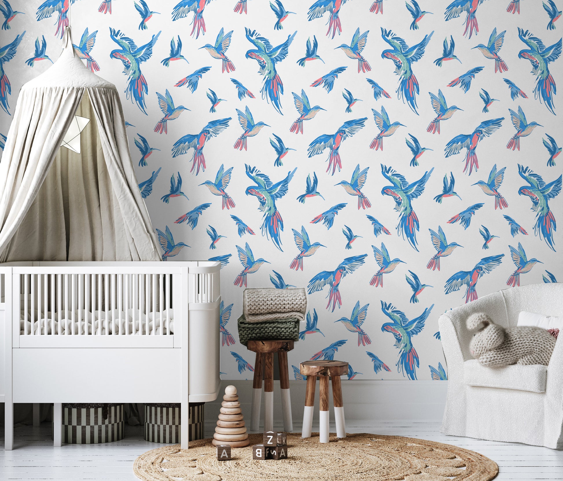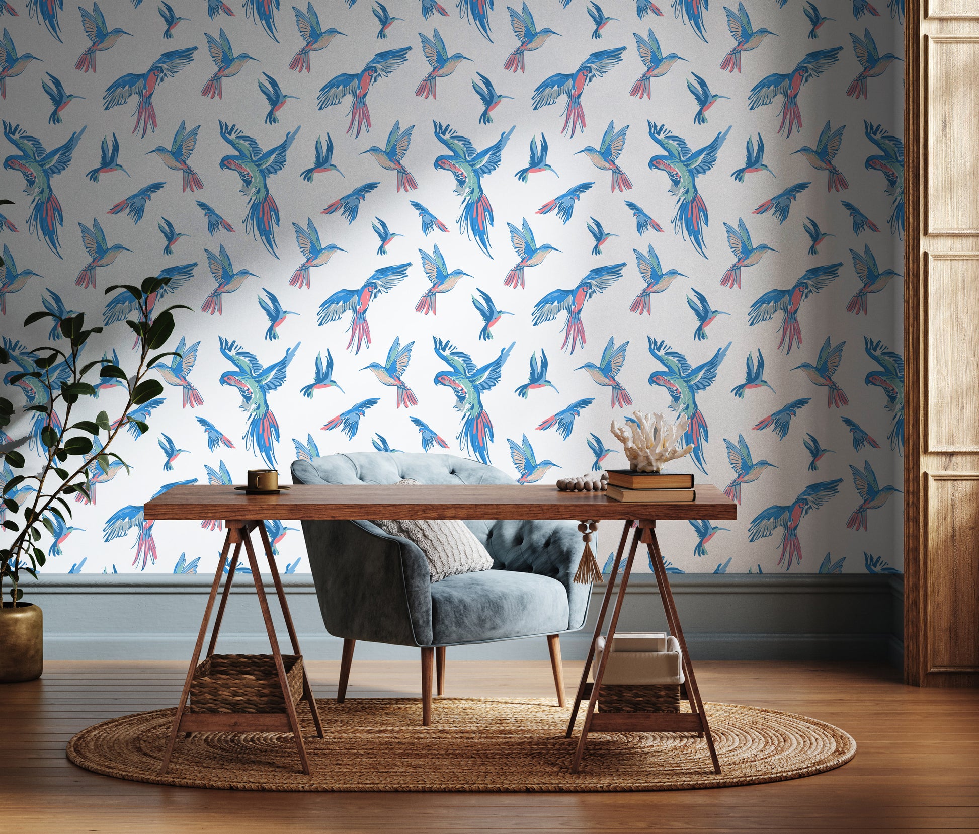 This wallpaper features watercolor tropical birds in flight the pattern is stunning and would look amazing in any room that needed a little color.