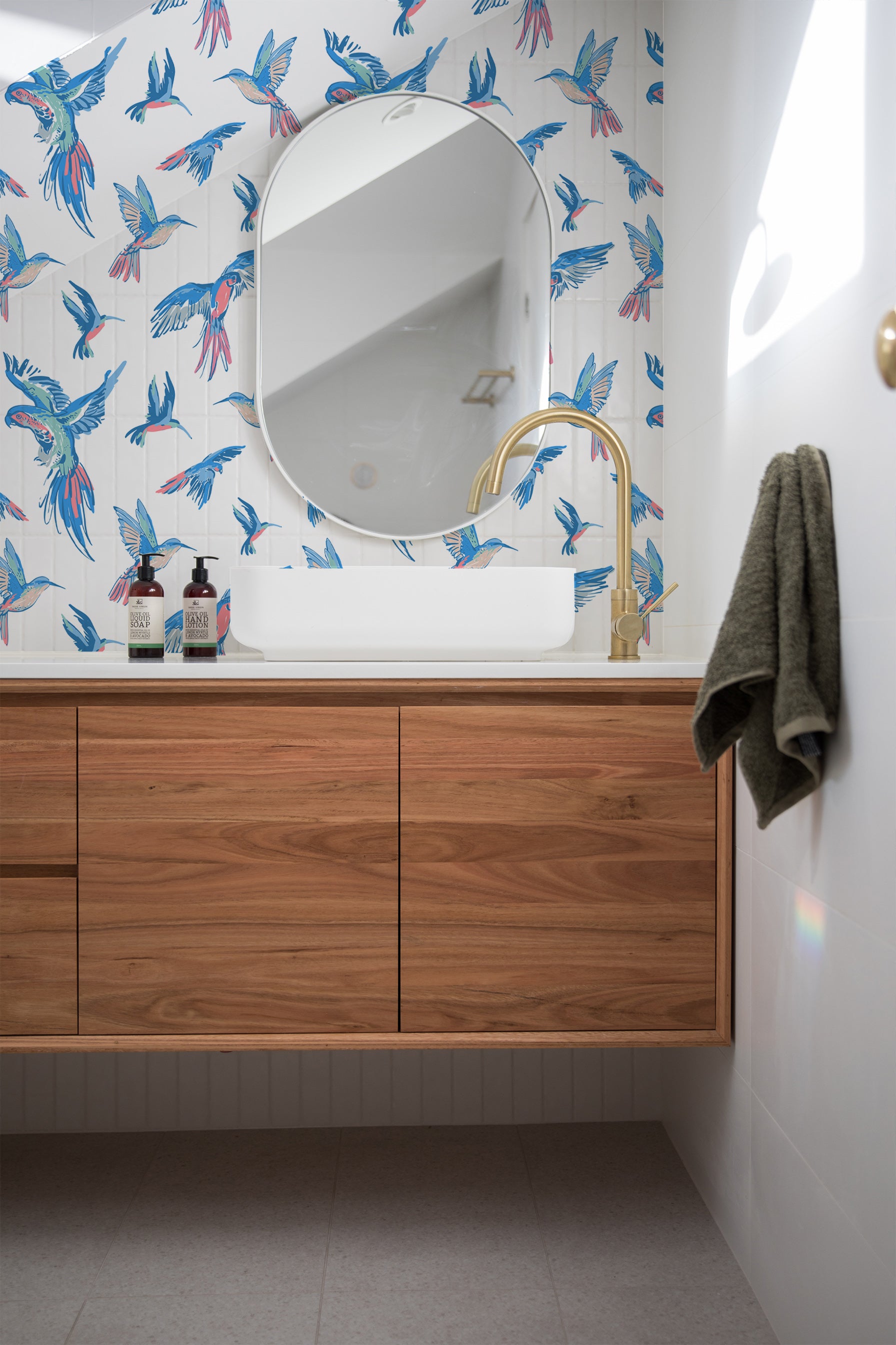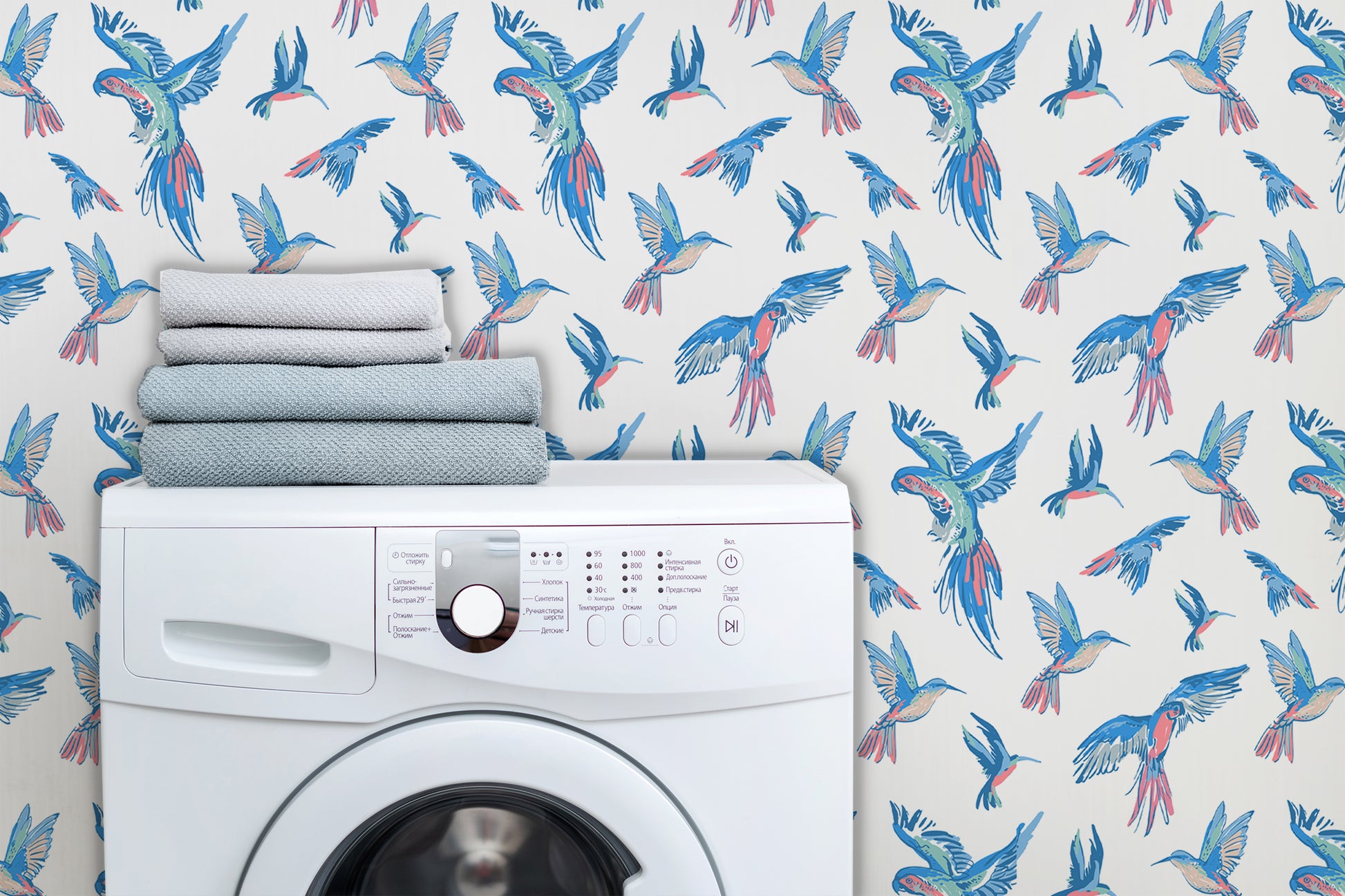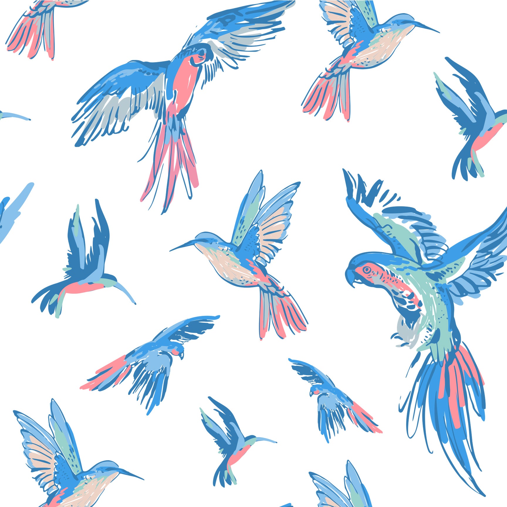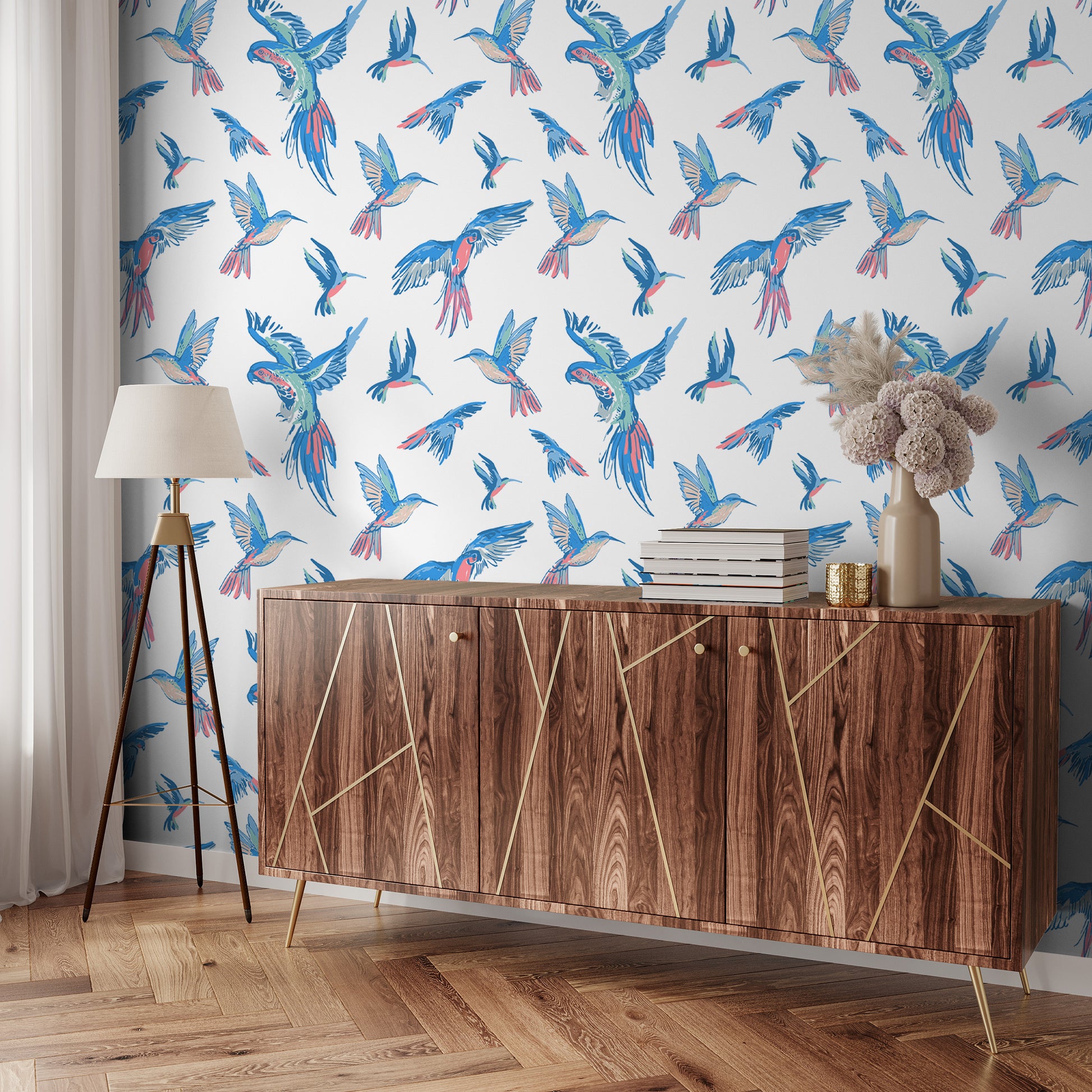 This wallpaper features watercolor tropical birds in flight the pattern is stunning and would look amazing in any room that needed a little color.