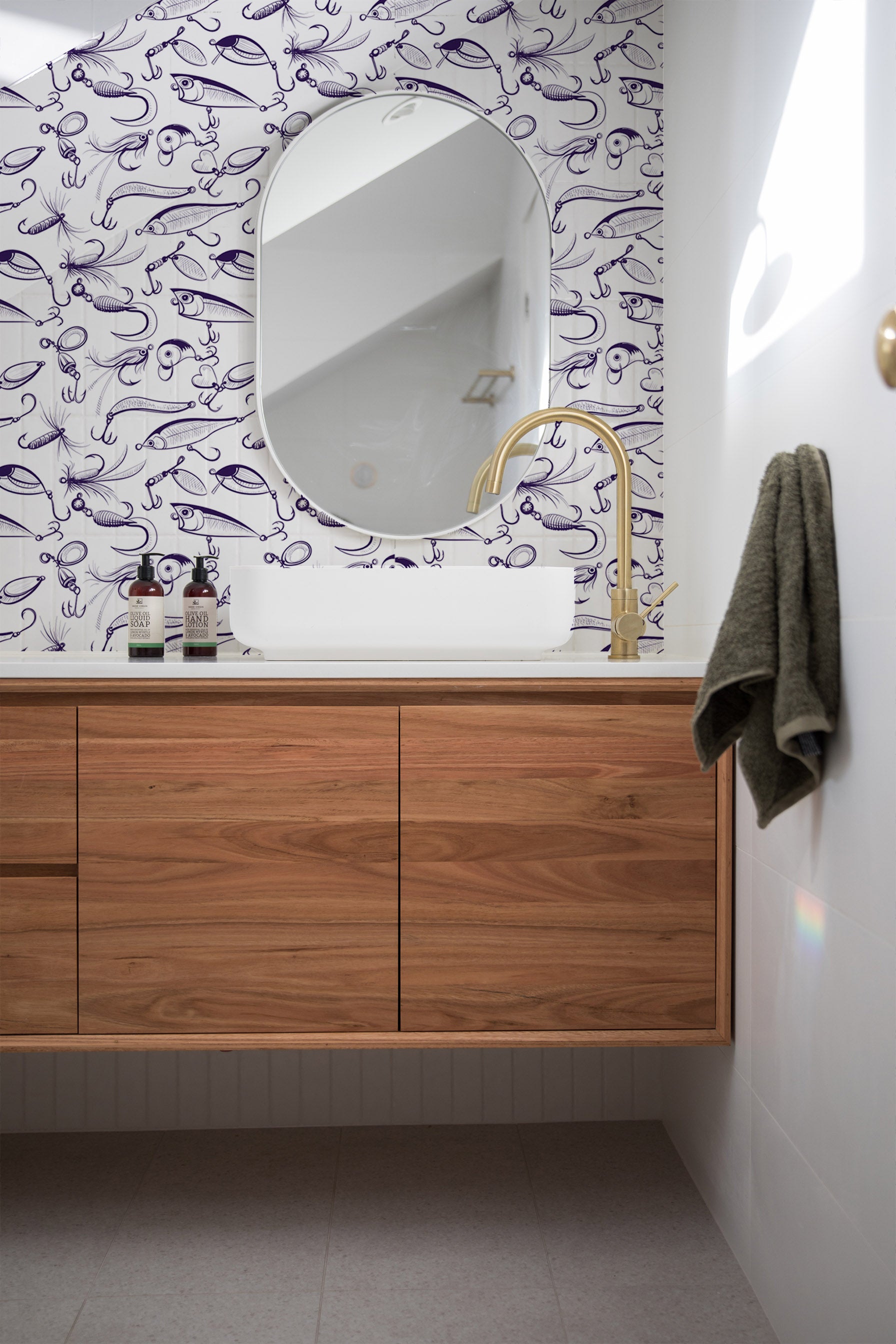 Our navy blue fishing lure wallpaper puts a playful spin on a classic nautical fish design. This wallpaper is perfect for a beach house, lake house, or a nautical nursery.