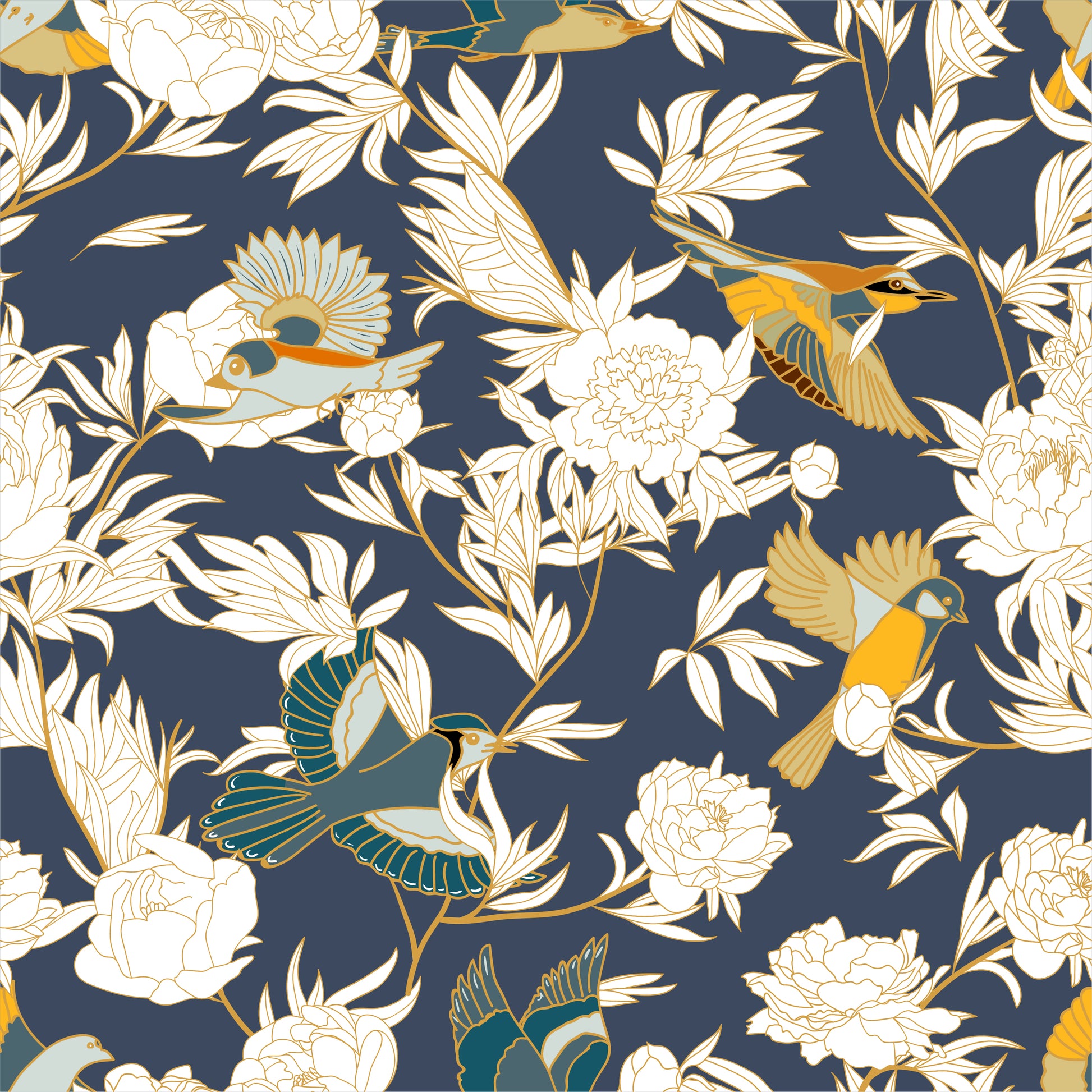 This wallpaper features vivid elegant birds in flight with soft white flowers on a navy blue background.