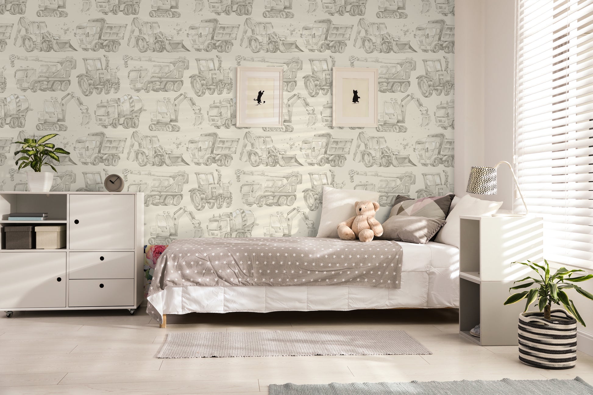 This wallpaper feature various construction trucks in a neutral color theme.