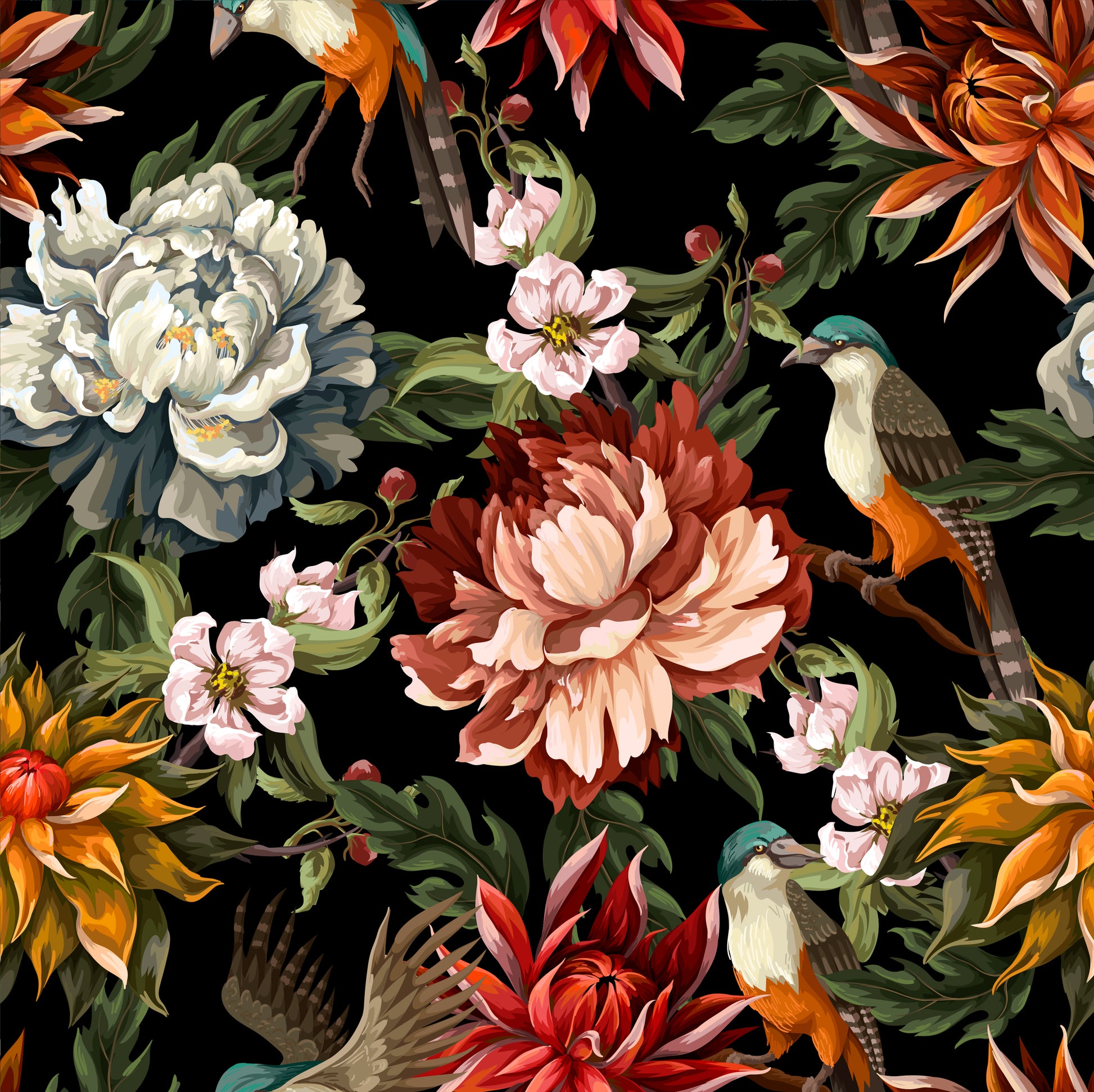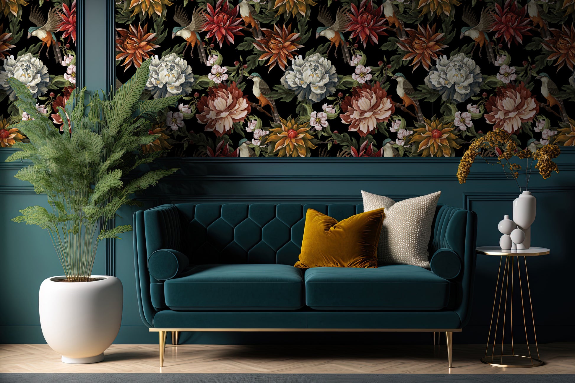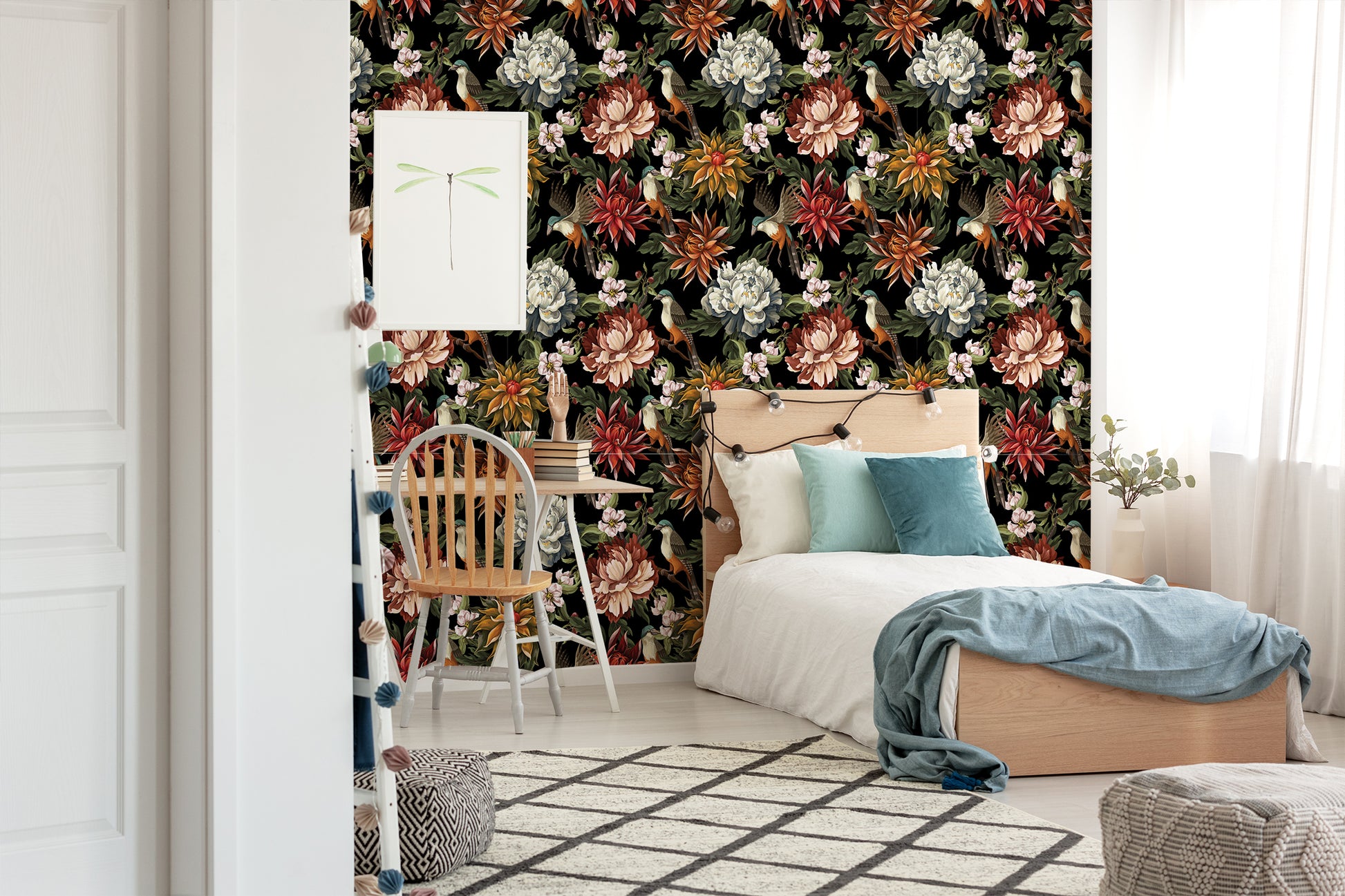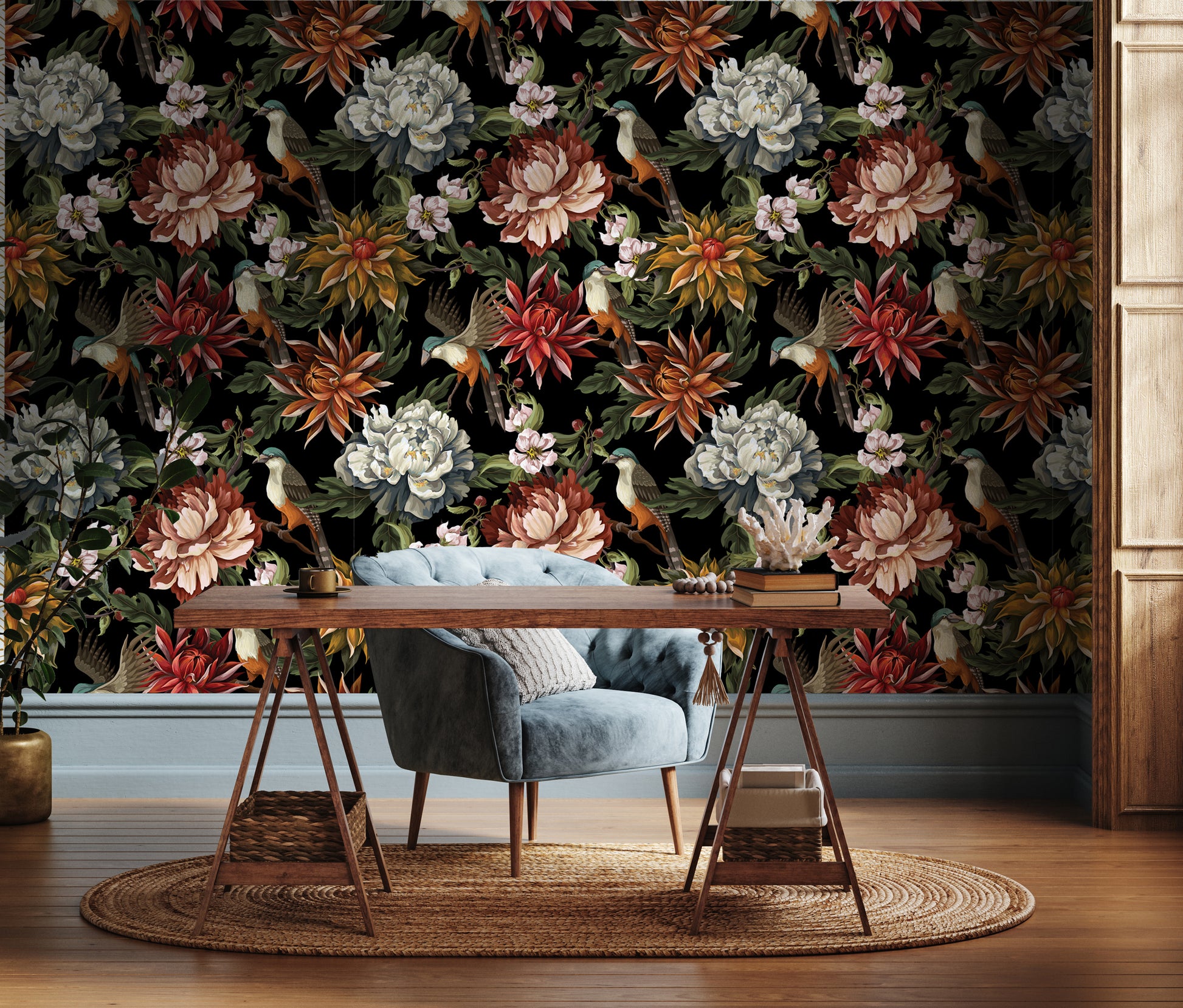 This dark floral wallpaper features rich flowers in red, pink, white and rust and delicate birds with a deep background.
