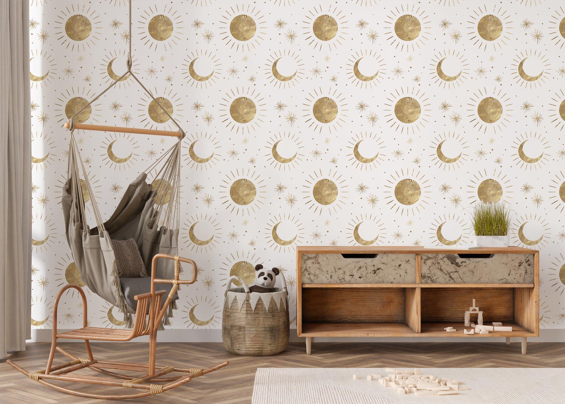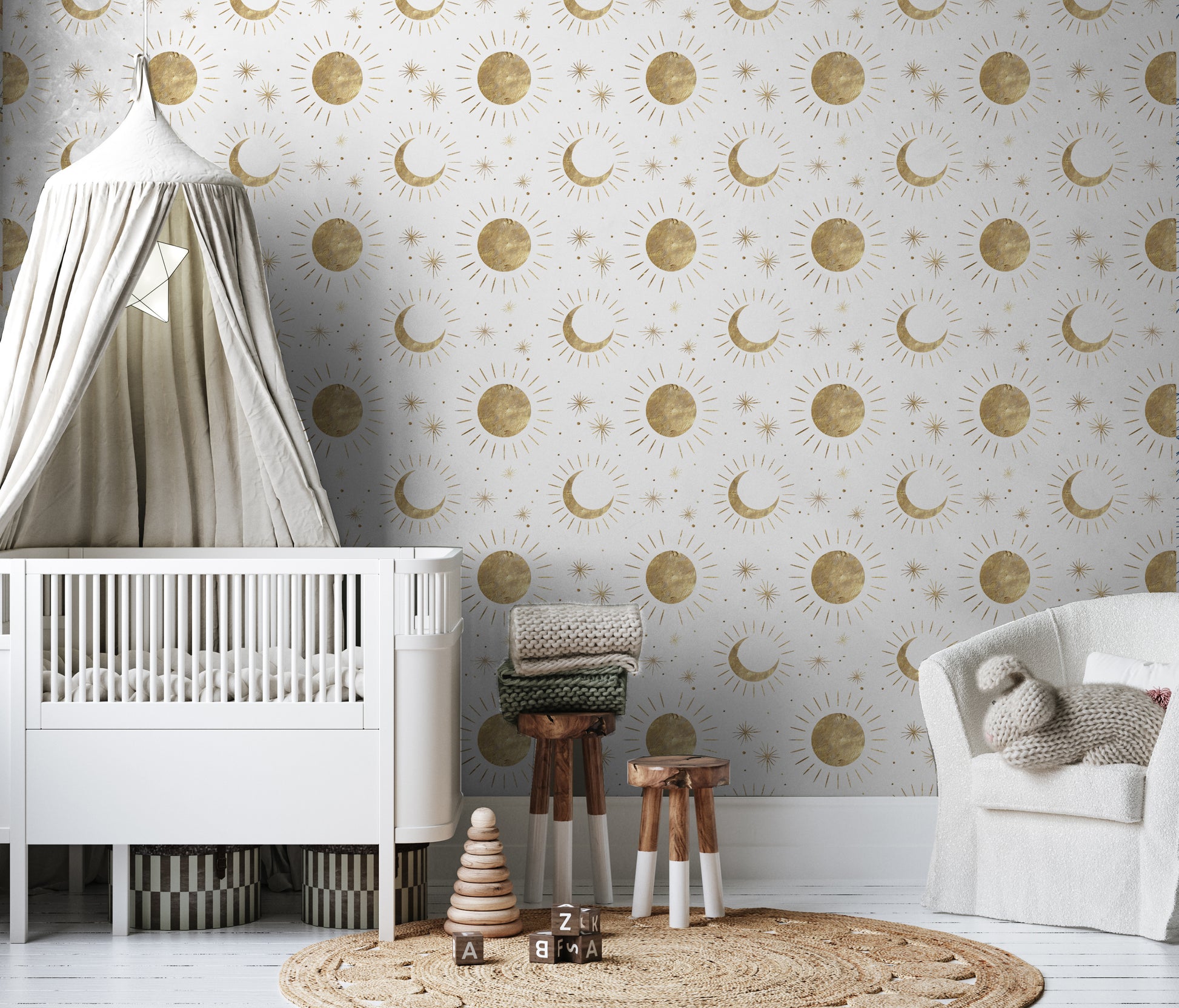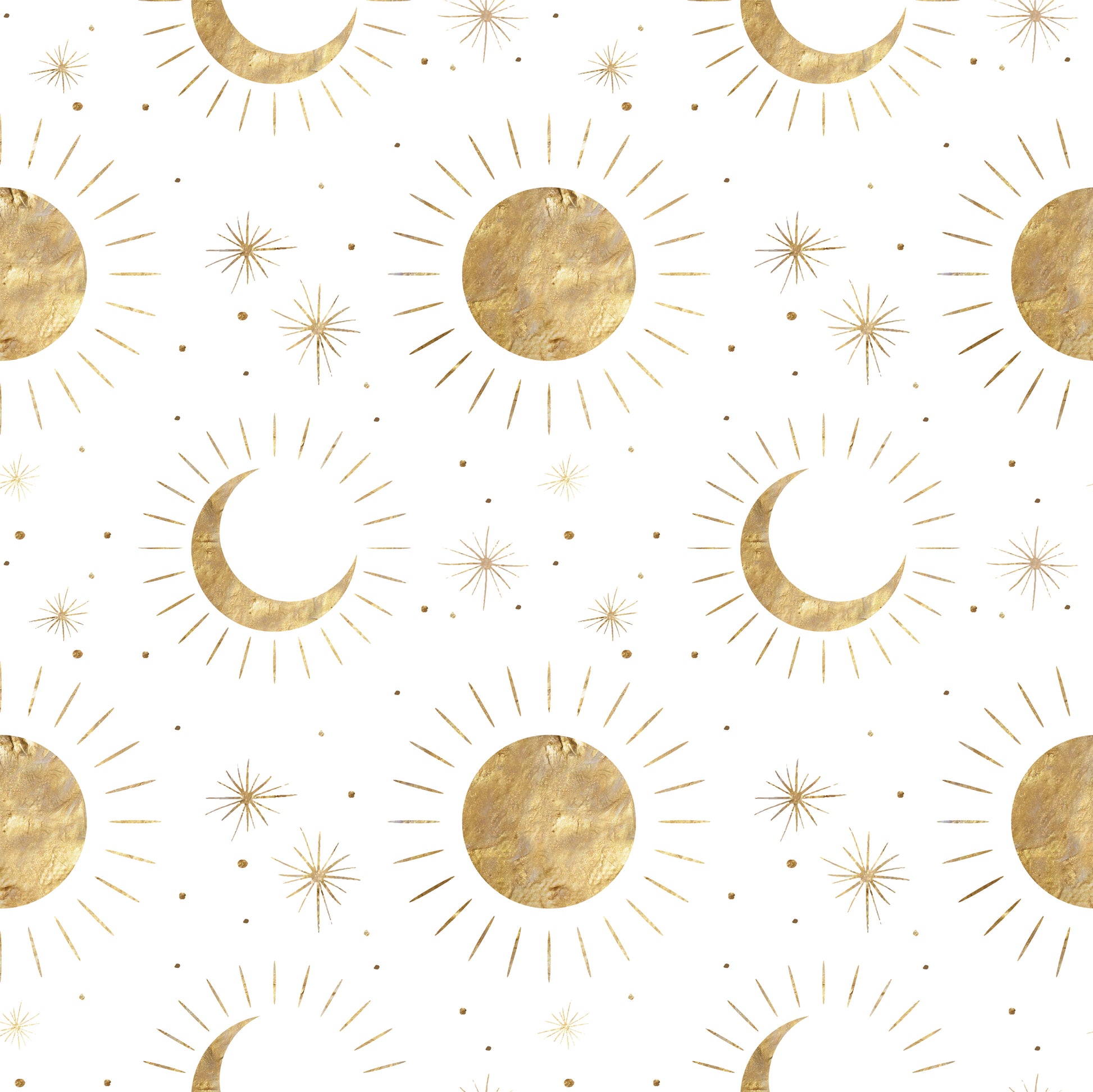 This wallpaper features a timeless golden moons, stars, and sun print on a oft white background.
