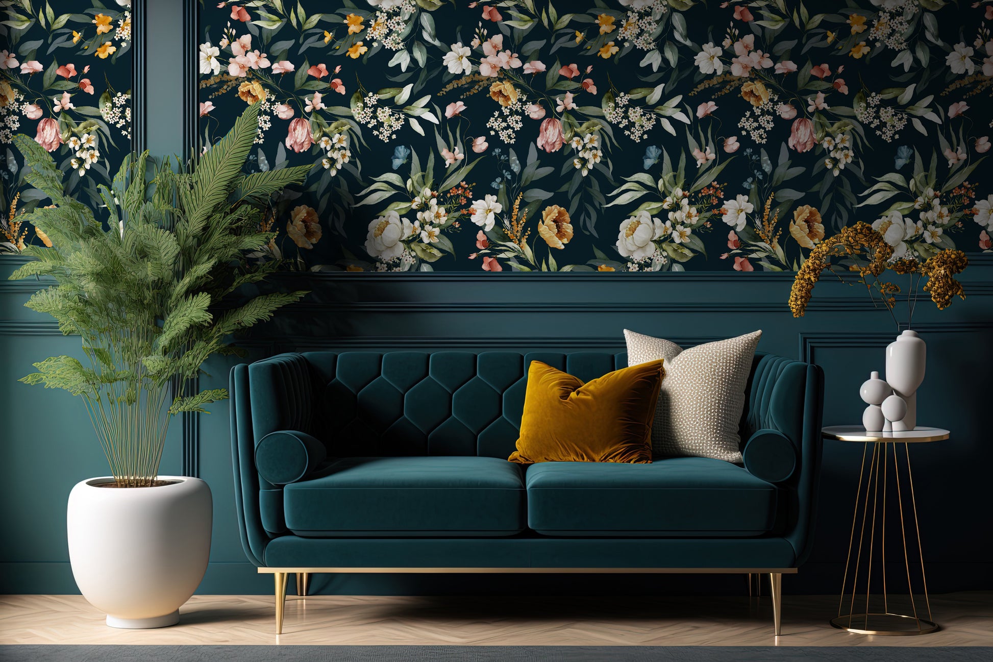 Peony Paradise will make any room feel like paradise. This wallpaper features soft pale floral on a moody navy background.