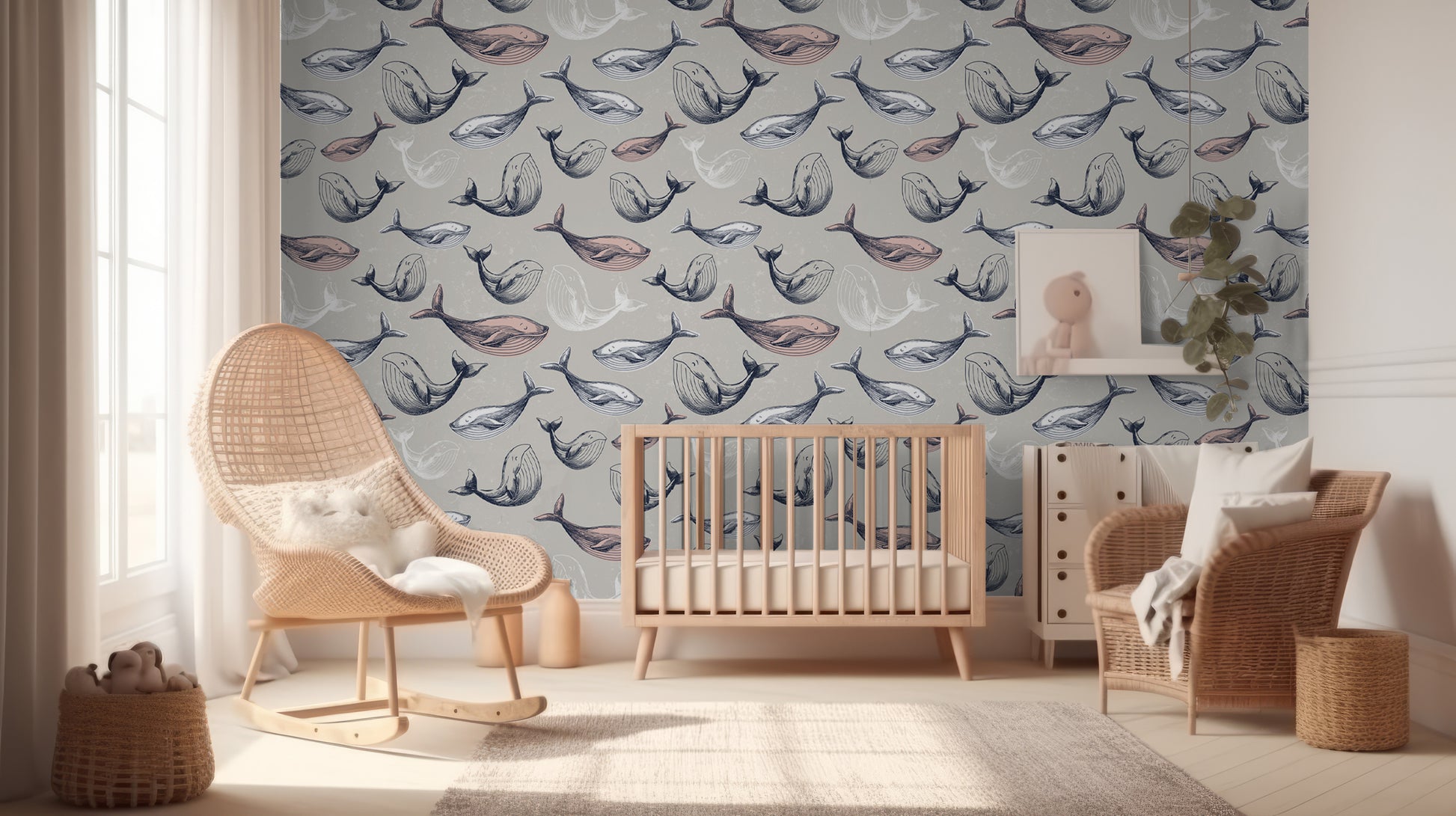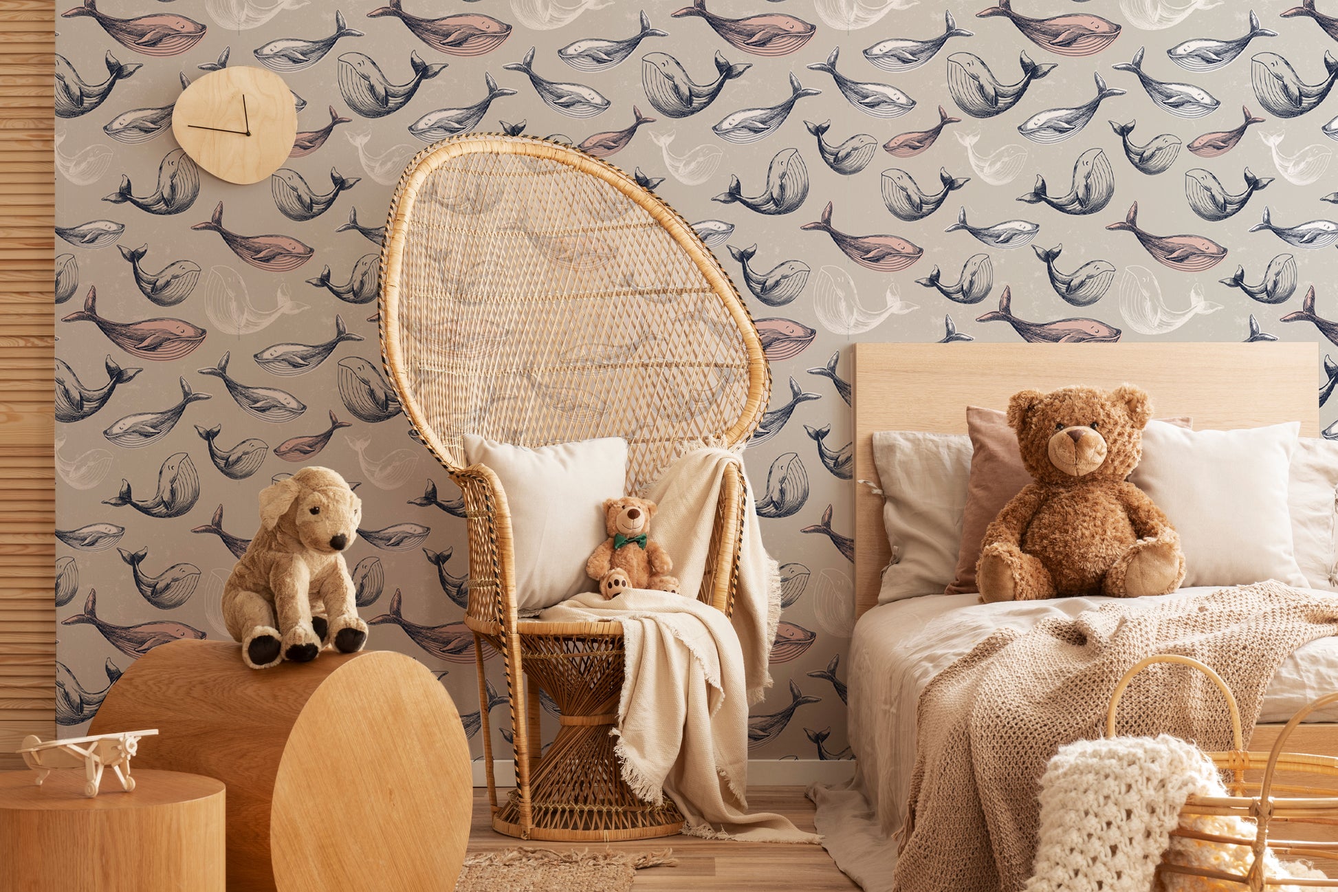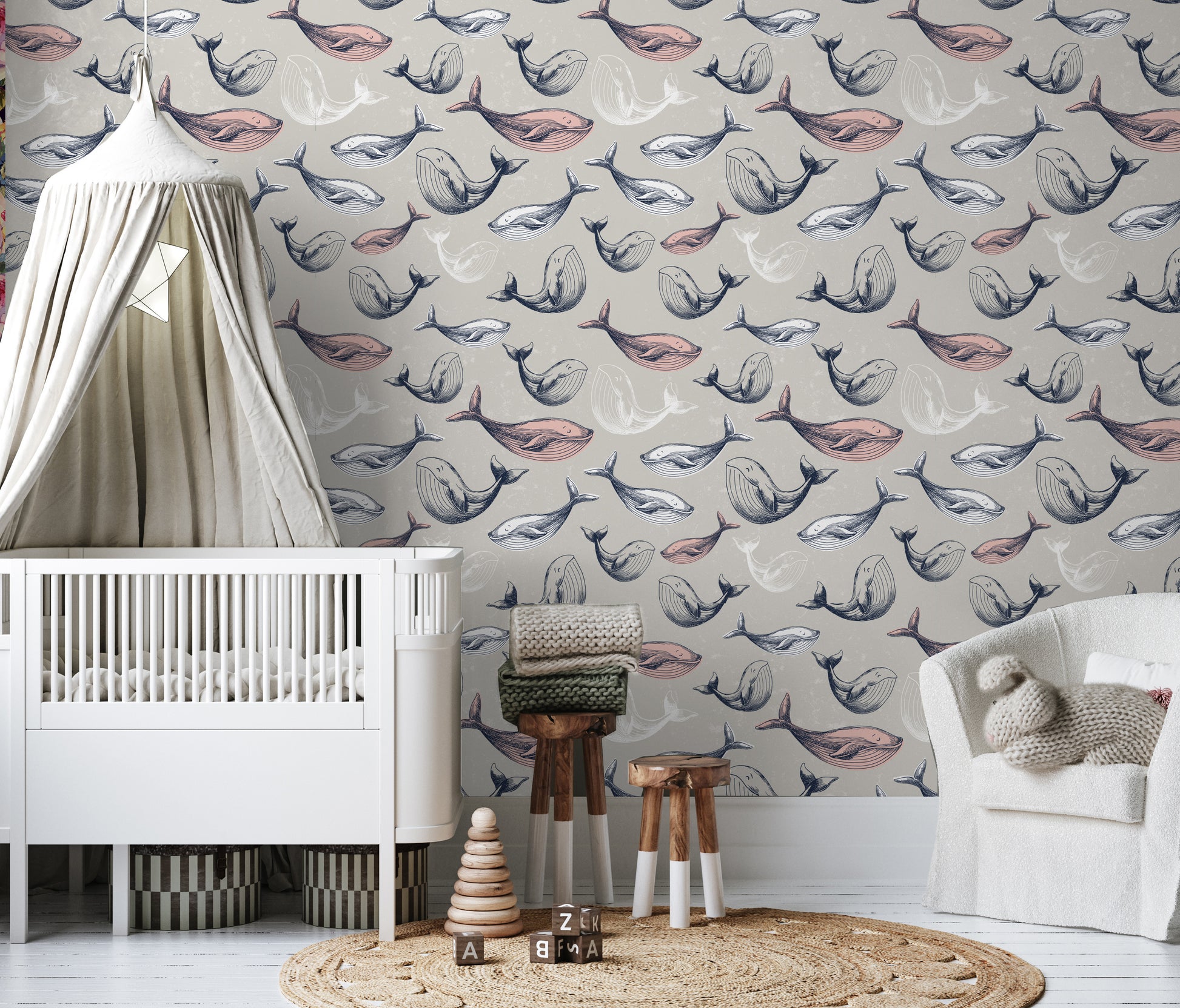 Nautical Whale Removable peel and stick wallpaper. Our pink whale pattern wallpaper puts a girly spin on the the timeless nautical design. Perfect for a nautical nursery, beach house, or just so that you feel as though you are always on vacation.
