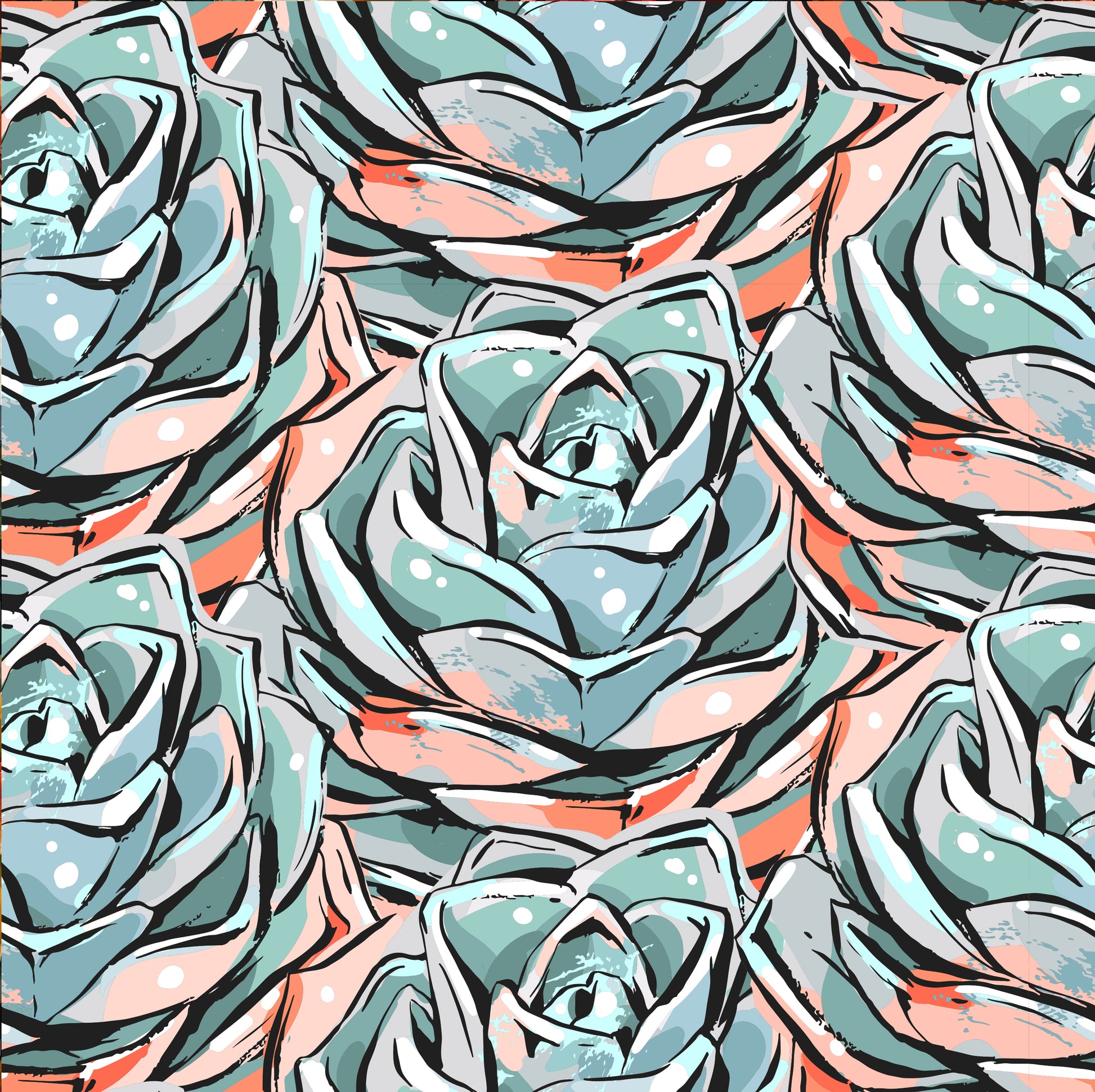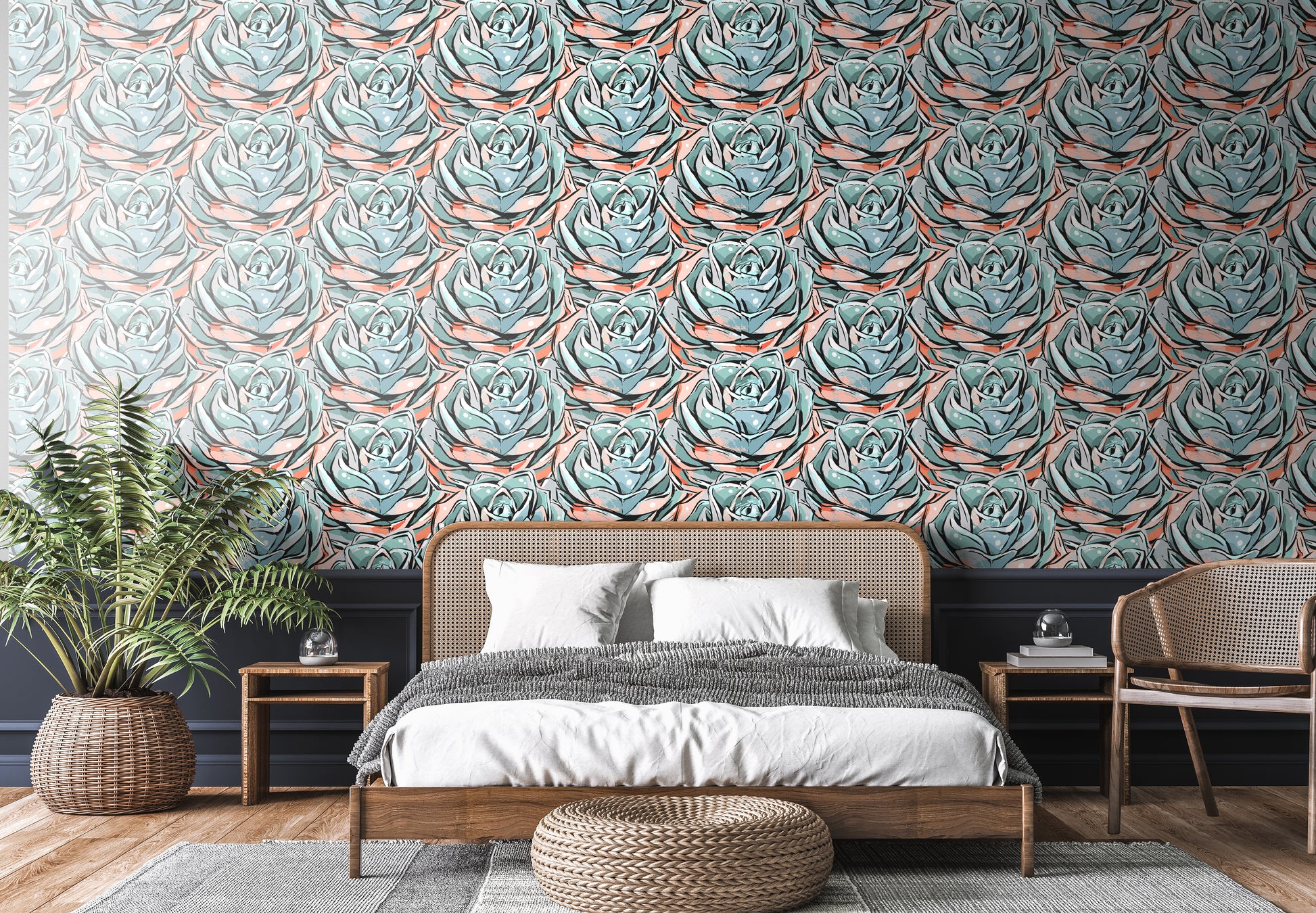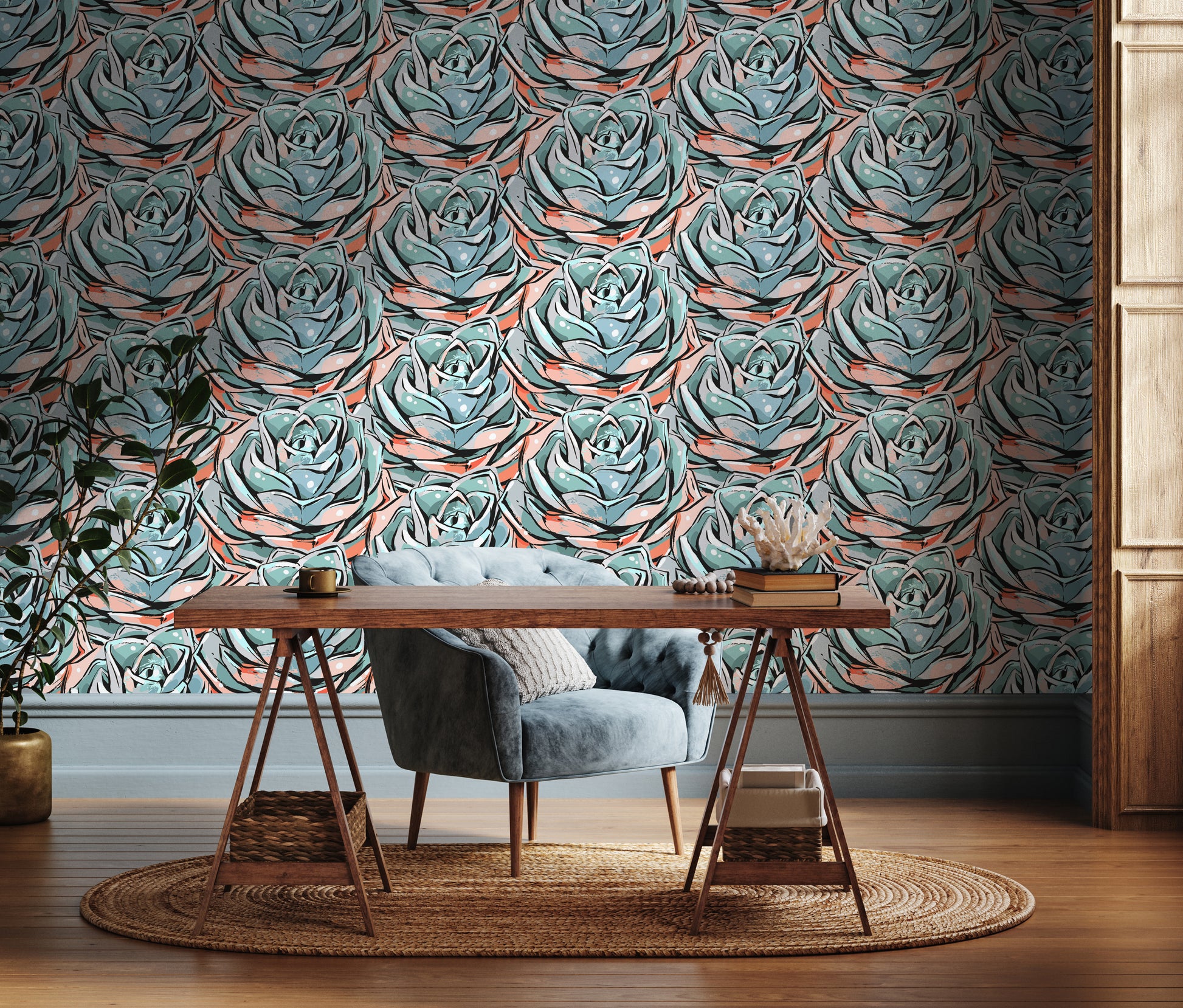 This modern desert wallpaper features painted succulents in a pop art style pattern.