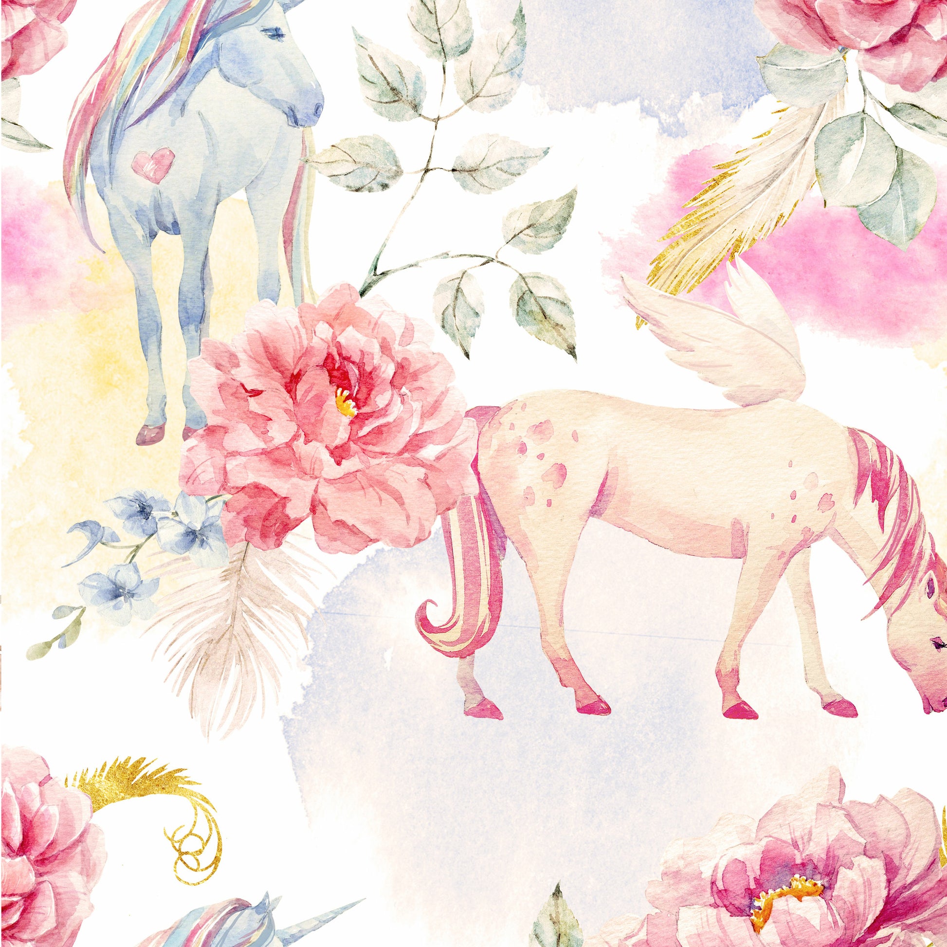 This watercolor unicorn wallpaper is breathtaking with soft shades of blue, gold, lavender, sage, and of course pink. This wallpaper will make any little one feel like a princess in their own fairy tale.