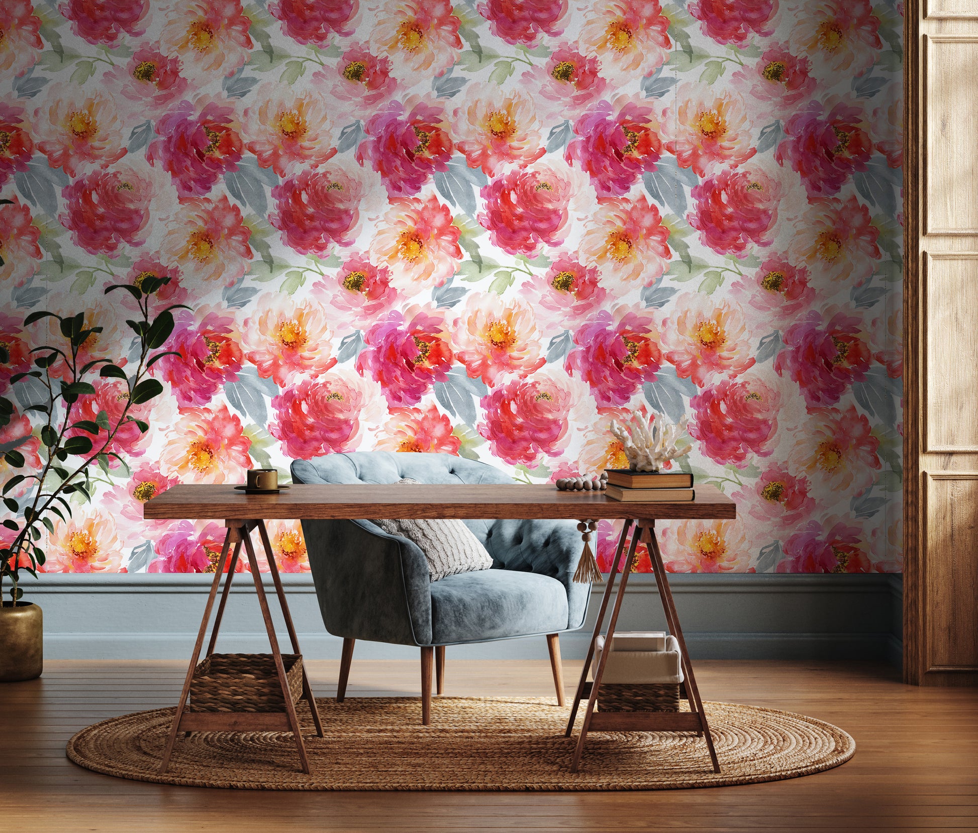 This high quality removable peel and stick bright floral watercolor wallpaper features vivid tone of hot pink and orange and soft pastel shade of blush pink, peach, blue and sage.