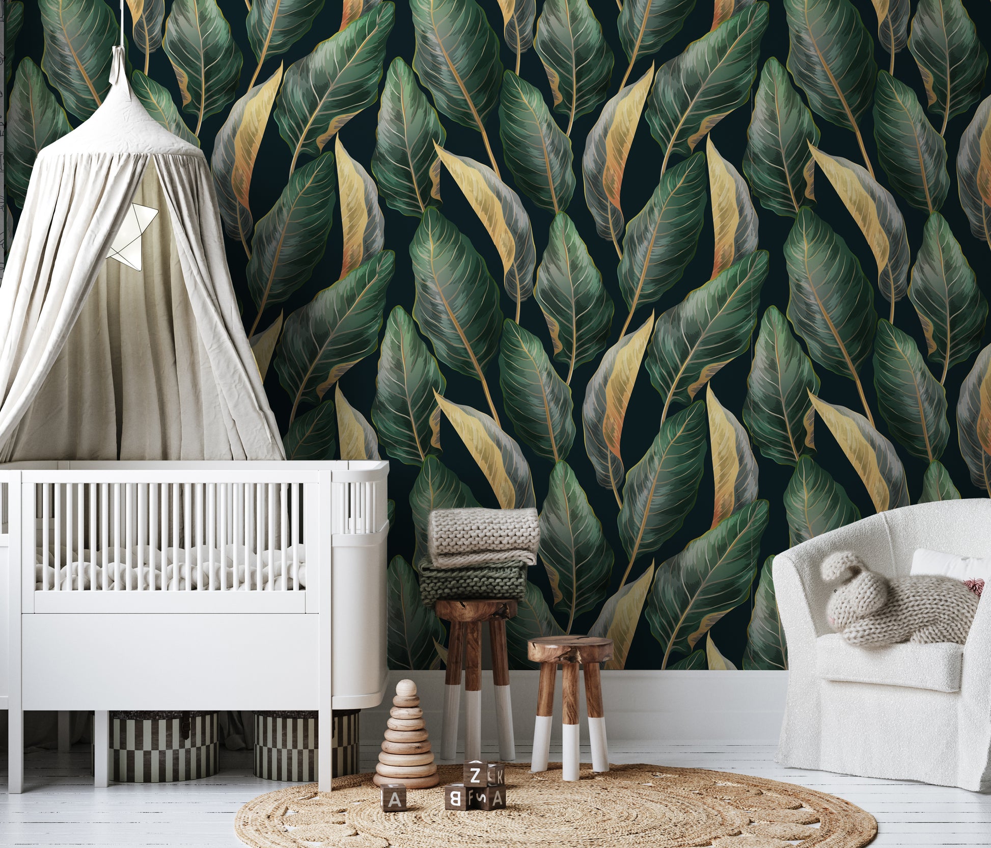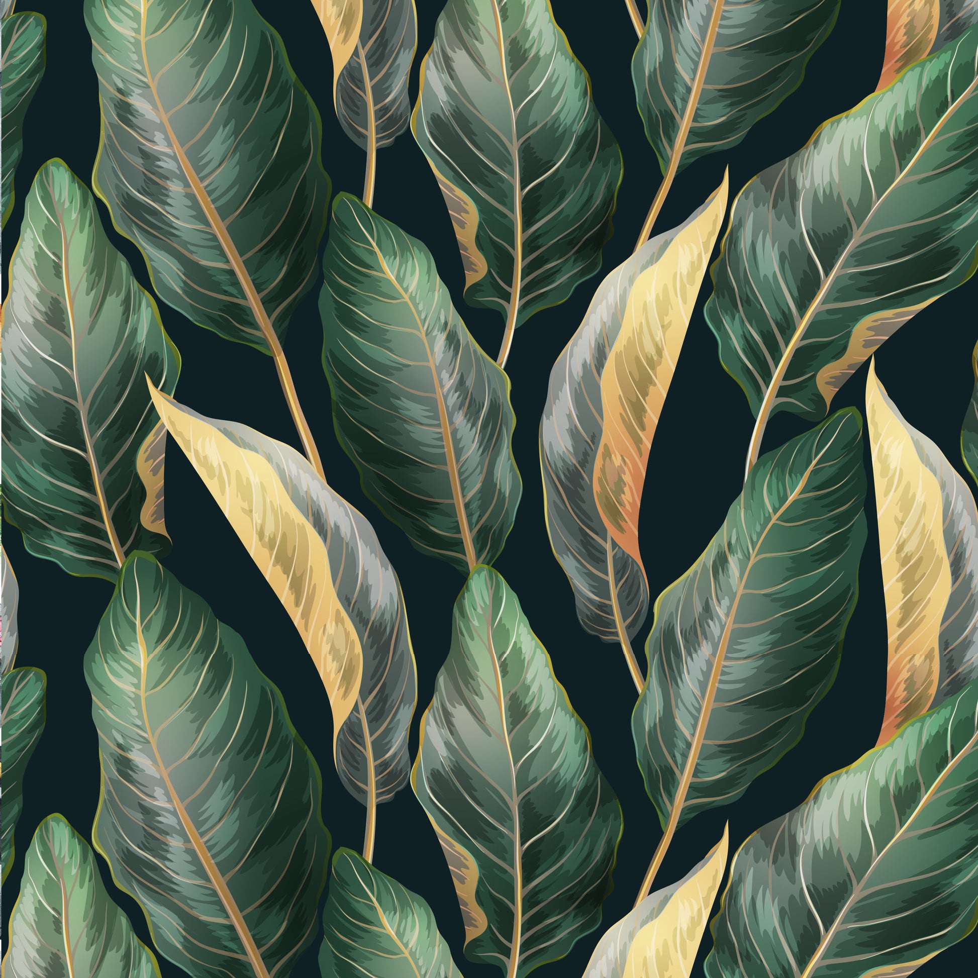 Thi wallpaper features detailed tropical leave with a dark black background.