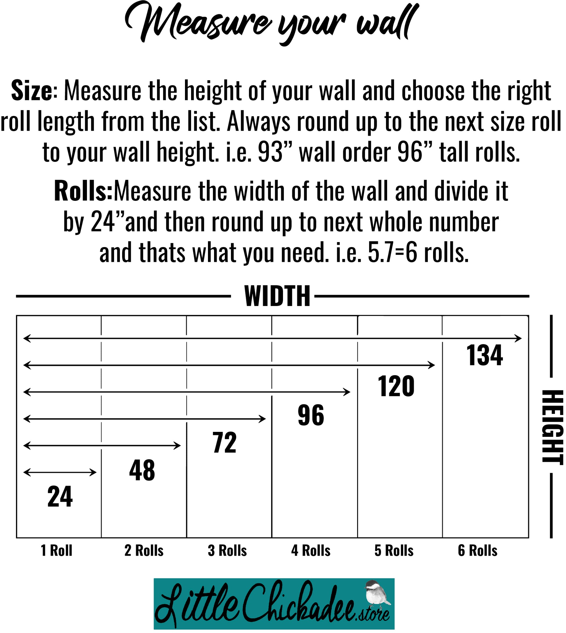 Next, measure the height of your wall to determine the appropriate length of wallpaper. Our wallpaper comes in lengths of 72 inches, 96 inches, and 120 inches, which are commonly used for drywall. Remember to round up when selecting the length, as it's easier to trim any excess. For taller walls, our patterns can be easily paneled together, so there's no need to worry.
