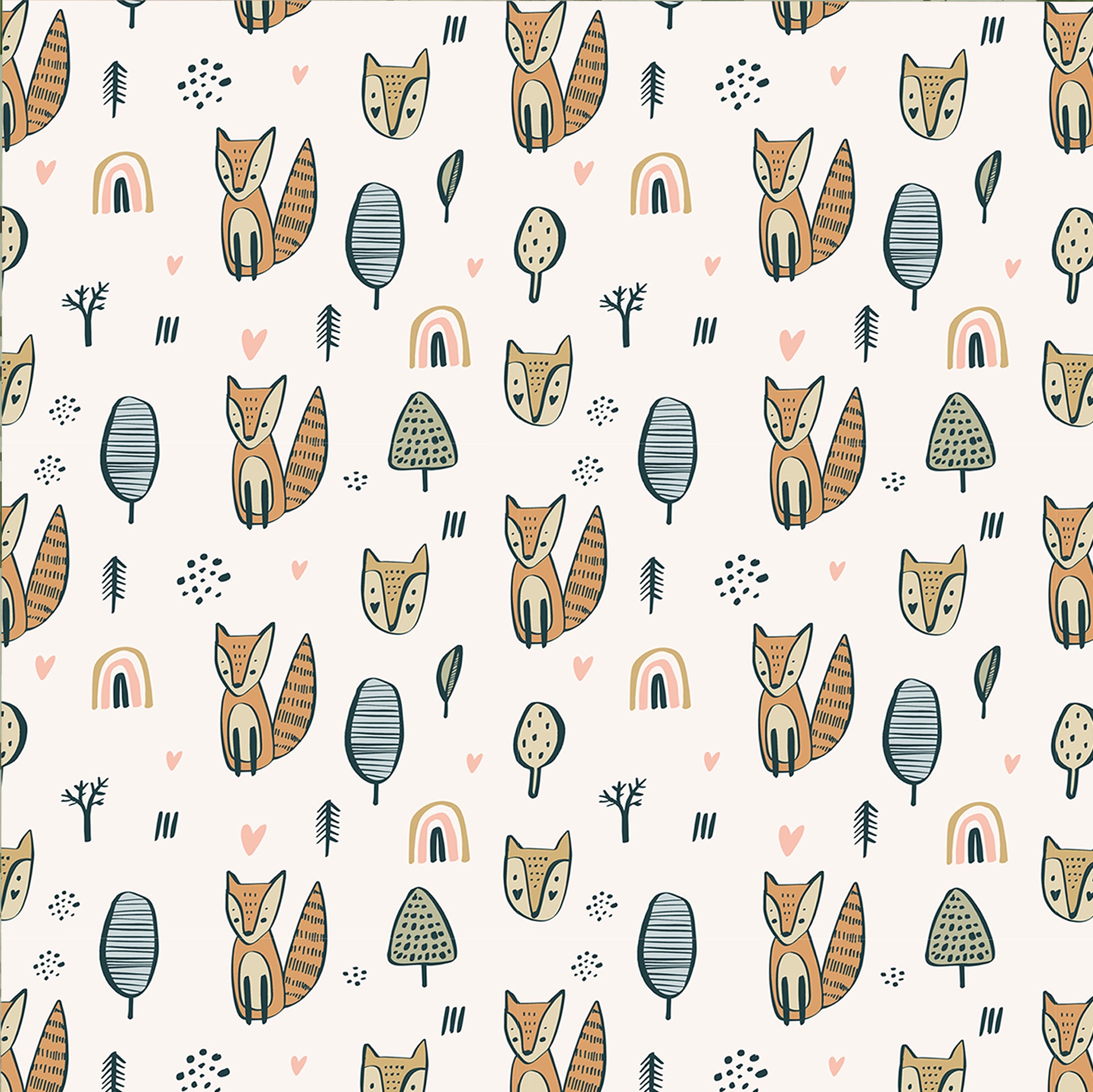 Thi wallpaper features cute foxes, rainbows, hearts, and trees.