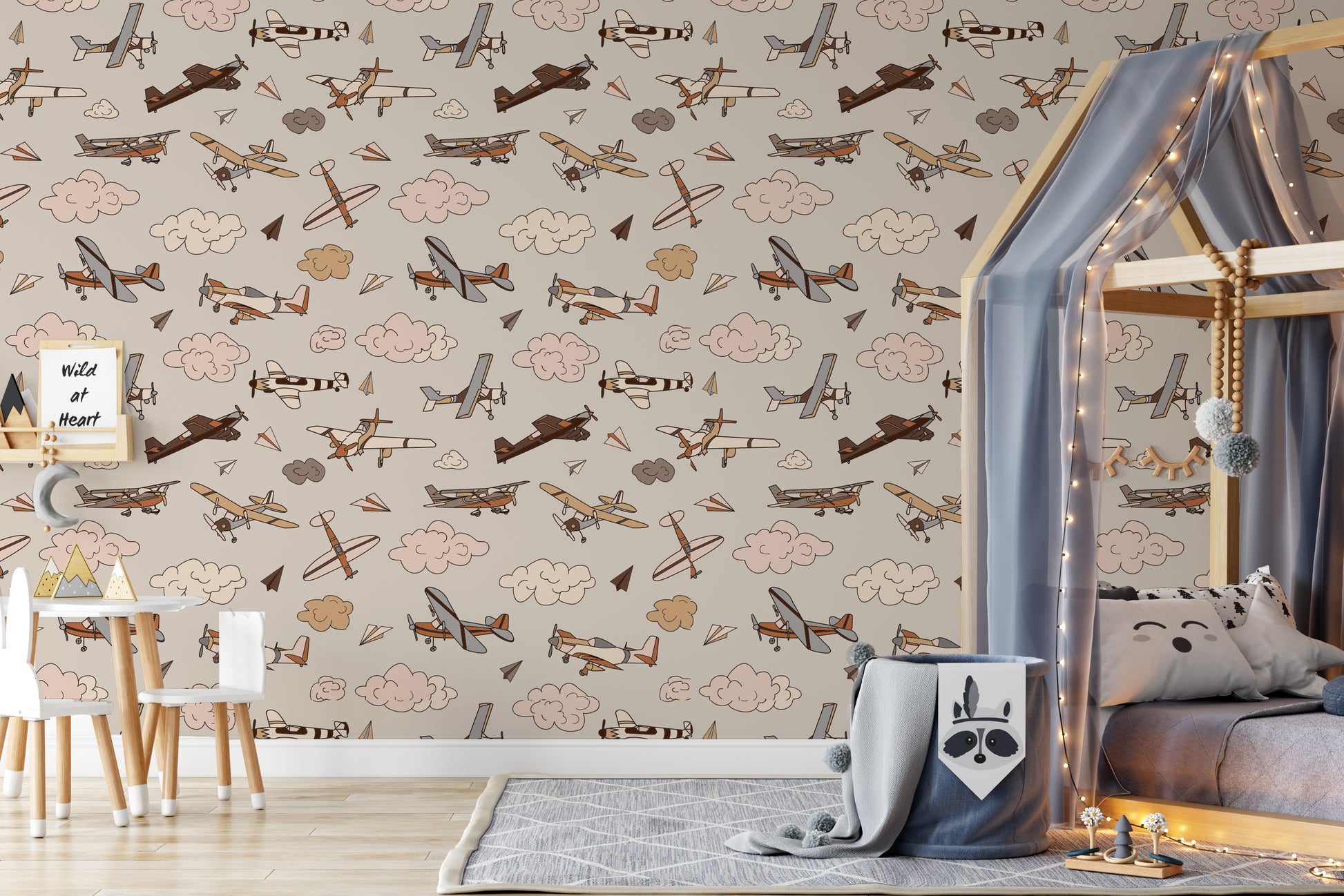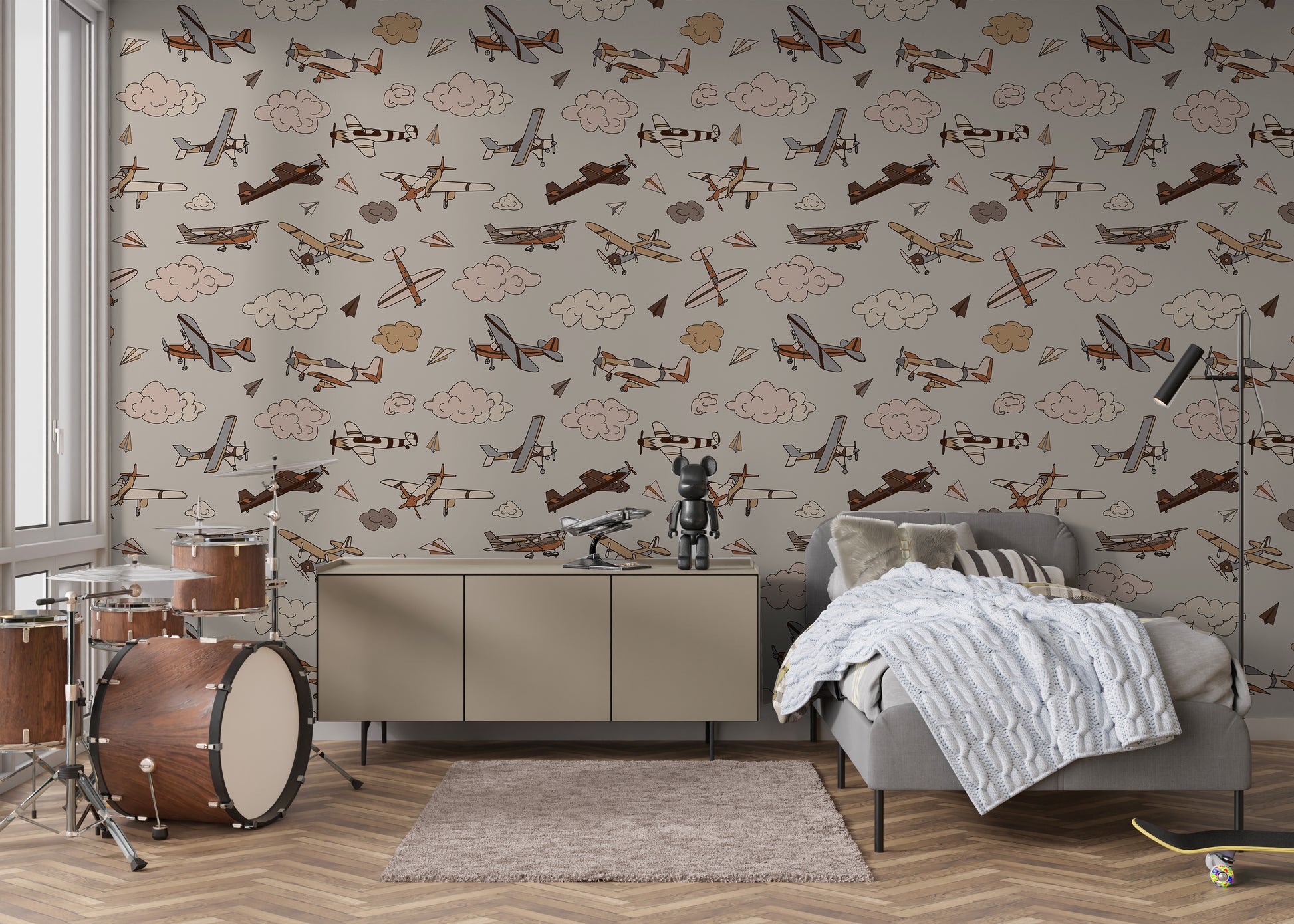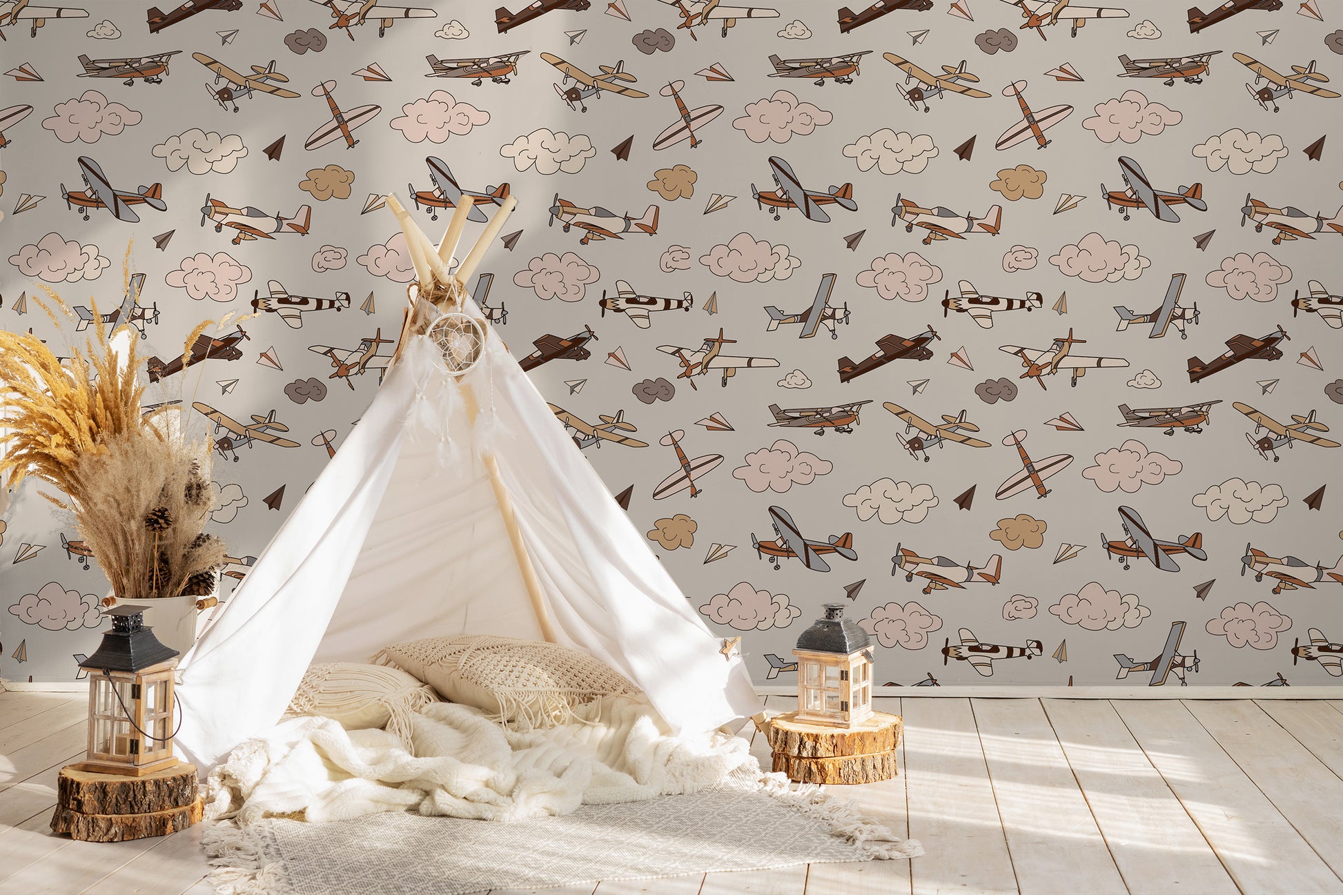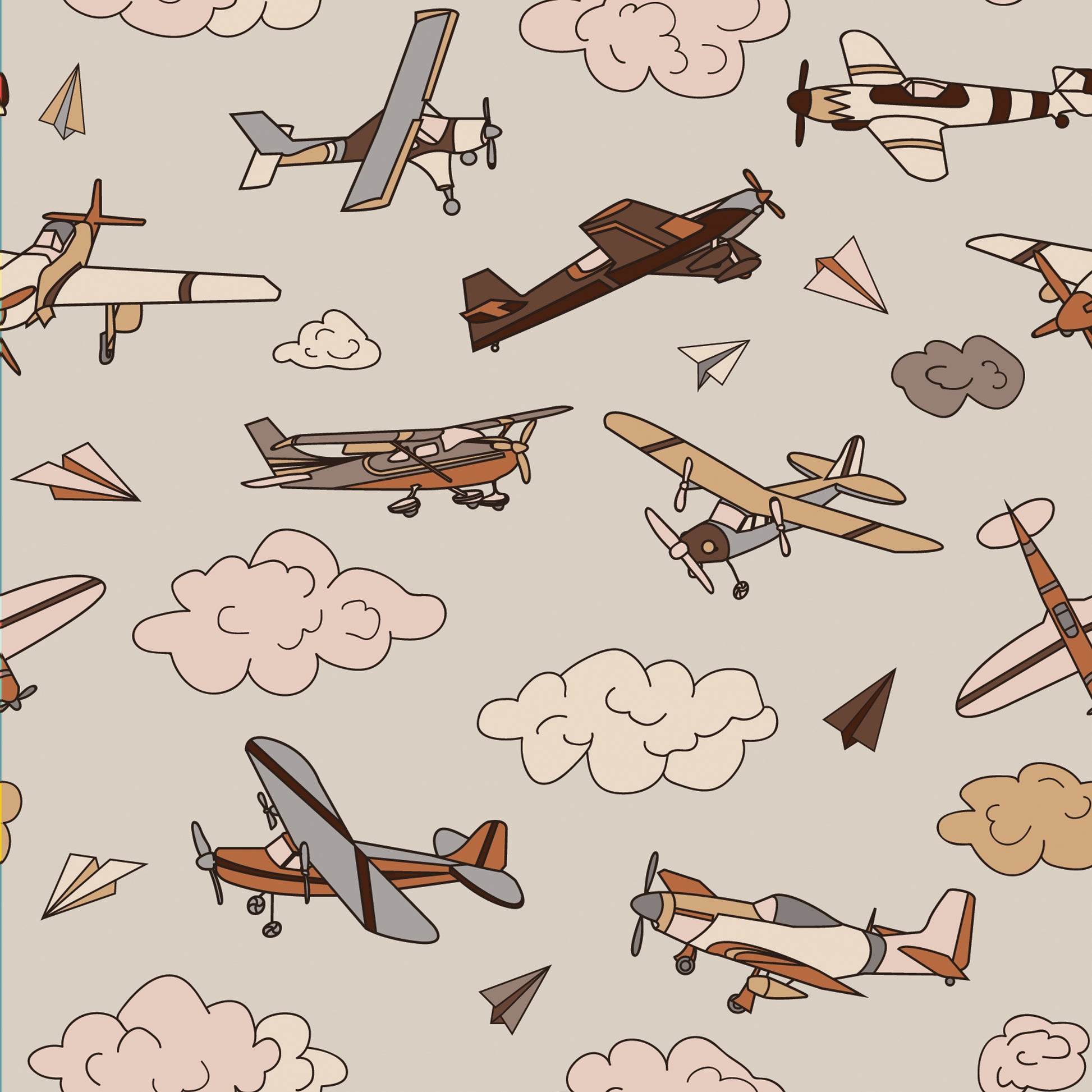 Your child's imagination will soar with this mixed neutral airplane wallpaper. In shades of chocolate, burnt orange, gray, beige, cream and tan it will go with any decor.