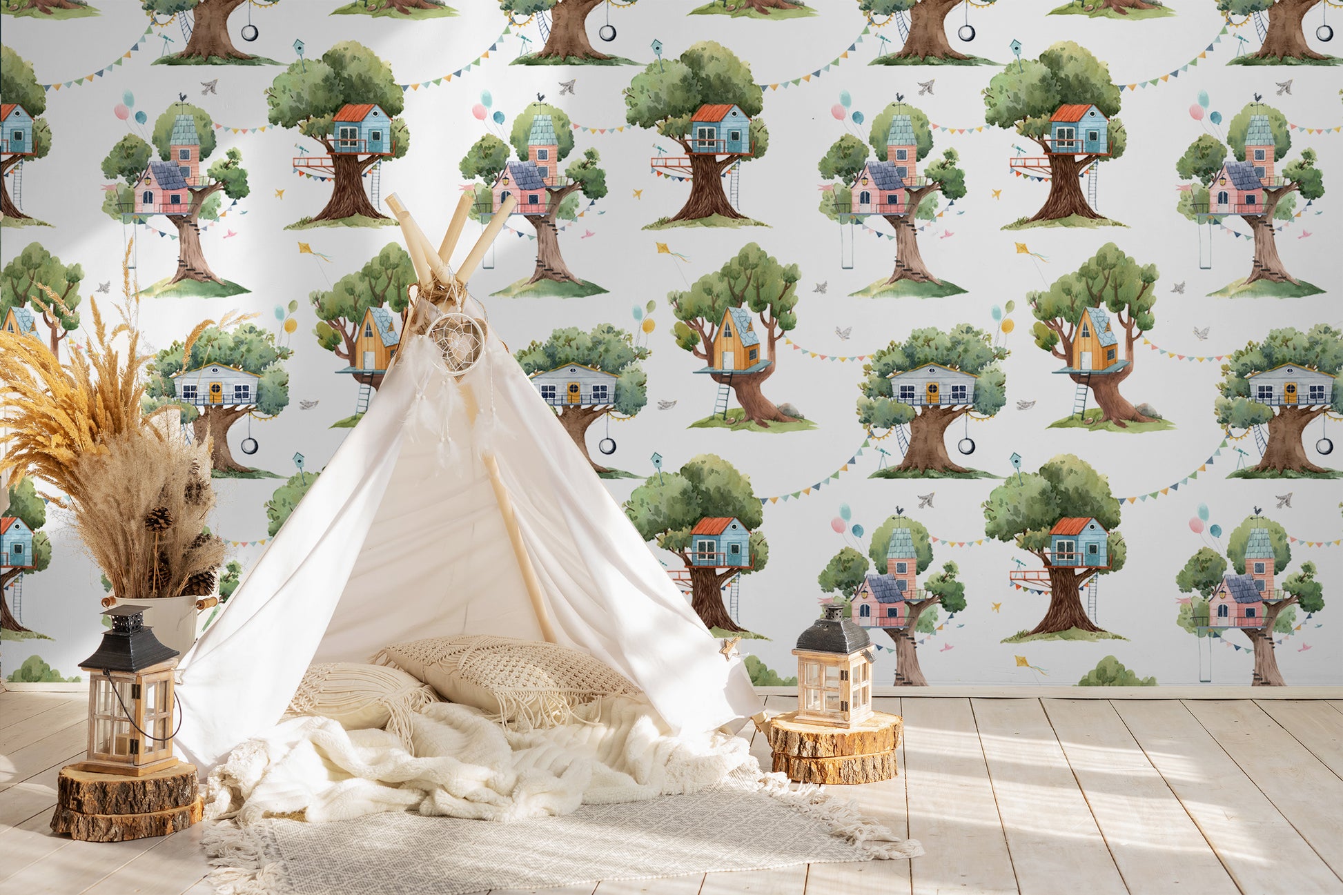 This colorful watercolor treehouse wallpaper i perfect for a gender neutral nursery or playroom.